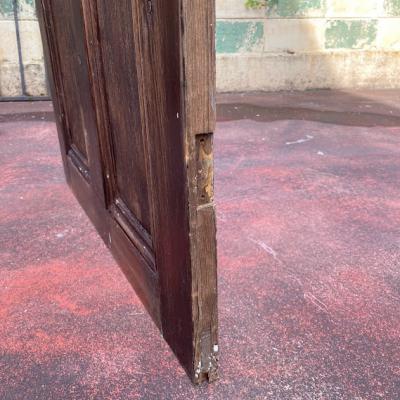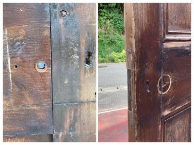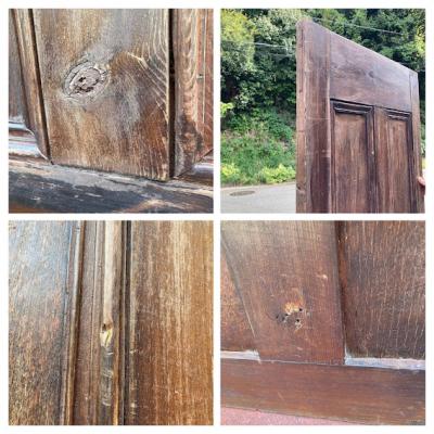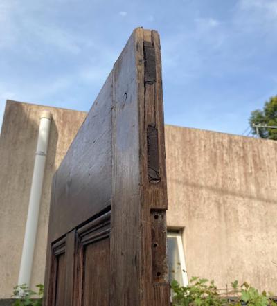 落ち着いたブラウンに塗装されたパインドア。木の木目や節目がうっすらと浮かび上がり優しい印象です。ドアノブ・鍵は付属していません。丁番の跡が3か所あり。ドアノブ跡や経年劣化による凹凸、小さな傷があります。室内ドア向きとなります。日本の規格のサイズではありませんので、取り付けにつきましてはご自身の契約されている施工業者さまにお問合せください。福岡市中心部はお店から配達できますが、それ以外の地域はヤマト家財便の利用となります。予めご了承ください。