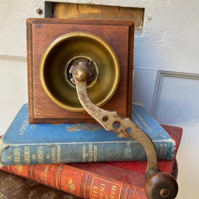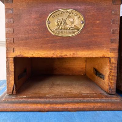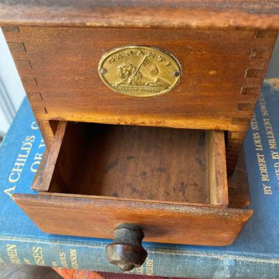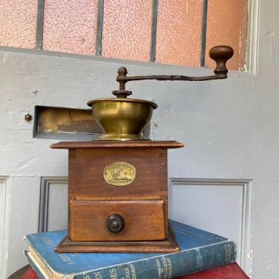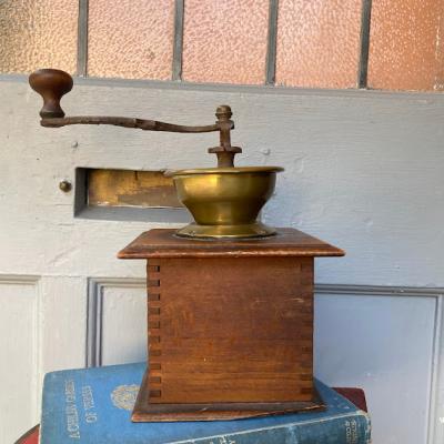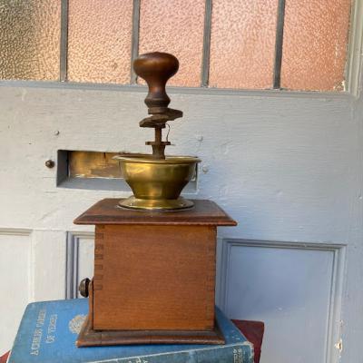ずっしりとした真鍮のパーツがカッコいいコーヒーミルです。ハンドルは独特の音を鳴らしスムーズに回ります。こちらは実際に豆を挽くというよりは、お部屋のインテリアとしてお楽しみいただくものとなりますため、雰囲気のあるくすみやサビなどはそのままにしております。小さな木製の引き出しが付いていますので、ショップカードをいれたり、小さな観葉植物をレイアウトしても素敵ですね。少し見えずらいですが、背面の下に一部カケがございます。経年劣化により割れた部分も丸い手触りにはなっていますのでケガをすることはないのでご安心ください。古道具がお好きな方、お店のアクセントになるものをお探しの方におすすめ。