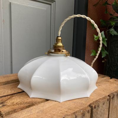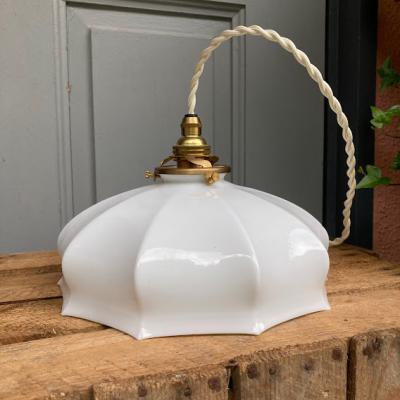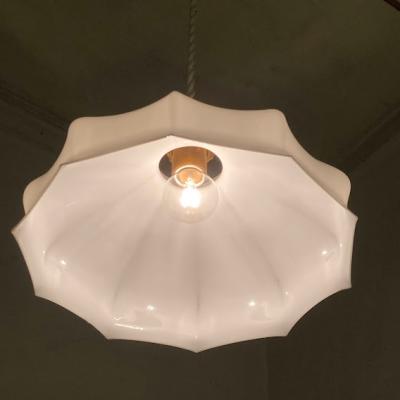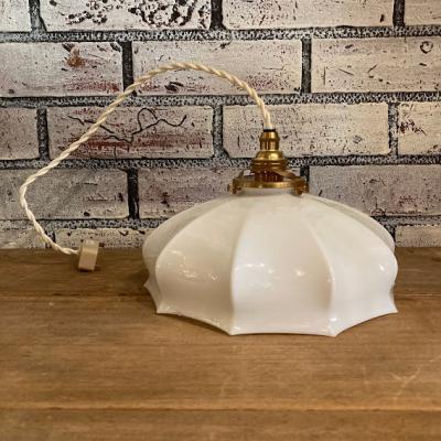 フランス製の白いガラスシェード。つるんとしたホワイトのシンプルなデザインはどんなお部屋にも合いそうですね。大きな割れなどはありませんが、フチに製造時にできた1mmほどの凹凸があります。口金は日本で一般的なE17に変更してあるので、LED電球にも対応できます。お部屋の雰囲気に合わせてお好きなコードの色(ゴールド・ホワイト・ブラウン・クリア)と長さ(1mまでは無料調整・1mを超える場合は別途有料)を変更できます。特にご希望がない場合は撮影に使用したコード(ホワイト:約50㎝)・撮影に使用したお試し用電球1個付属にてお届けします。古道具がお好きな方、フレンチテイストのお部屋作りを楽しんでいる方におすすめ。