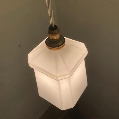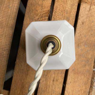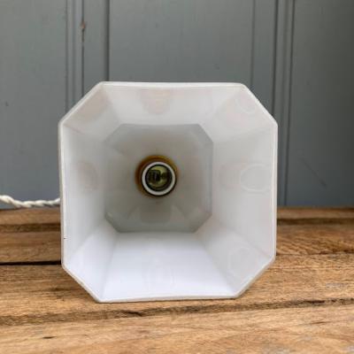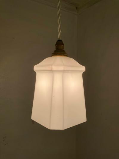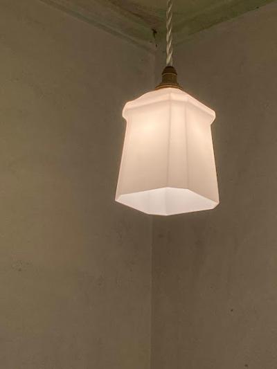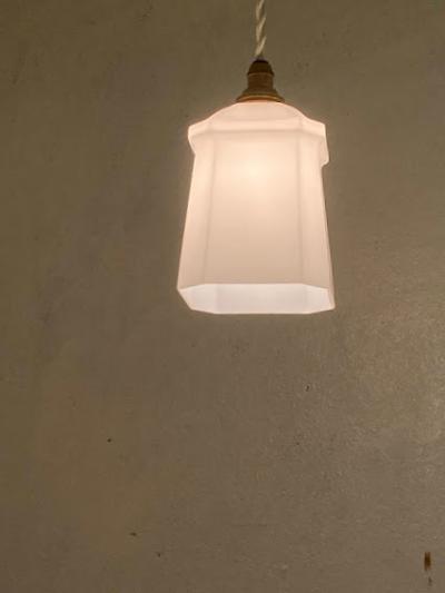 小さなサイズの白いガラスシェード。ぱっと見シンプルすぎるかな?と思うかもしれませんが、点灯すると独特の光が美しいシェードです。高さ約12㎝と小ぶりですので、玄関やトイレ、洗面スペースなどちょっとした場所にも使いやすそうです。同じタイプのものがもう一つありますので、2つ並べてダイニングやキッチンカウンターでも楽しめそう。電球の口金は日本で一般的なE17となり、LED電球にも対応。コードの色・長さがお好きに調整ができますので、お部屋の雰囲気に合わせてお申しつけください。ご希望がない場合は撮影に使用したコード(白)・長さ約50㎝にてお届けします。大きな破損は見られませんでしたが、ビンテージ品となりますので写真には写り切れない凹凸、フチのザラっとした感触がありますが使用には問題のないレベルです。新築・リフォーム・リノベーション中の方、店舗の方にもおすすめ。