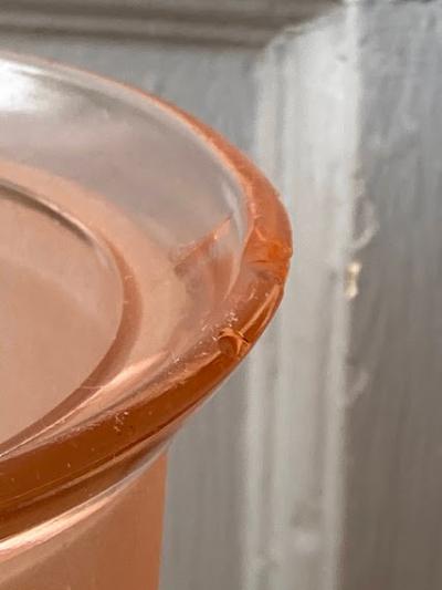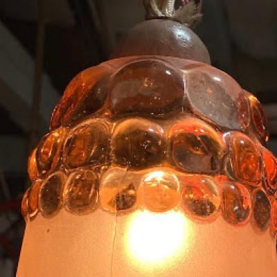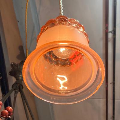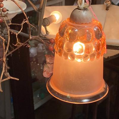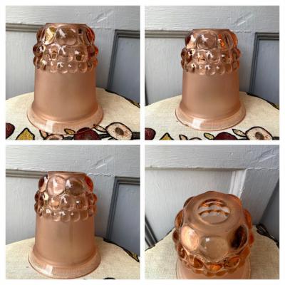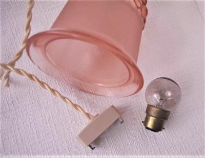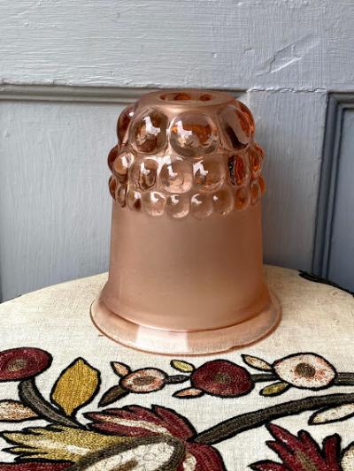 推定1930年代頃のシェリーカラーのランプシェードです。優しいピンクがお部屋をほっとする雰囲気に変えてくれますね。日光の下ではほんわりとしたピンクですが白熱球を灯すとシェリーカラーのような色合いに。あまり目立ちませんがフチの部分にほんの少しだけカケがあります。また現在イギリス式と呼ばれるピン式の電球が付いておりますが、ご希望がございましたら、日本で一般的なネジ式の口金サイズE17のソケットへ変更もできます。その際には上部に付属しているグレーの金具は外れ、ねじ式の金色のパーツへと変更になります。追加の画像などはLINEまたはメールからお送りできますので、お気軽にお問い合わせください。
