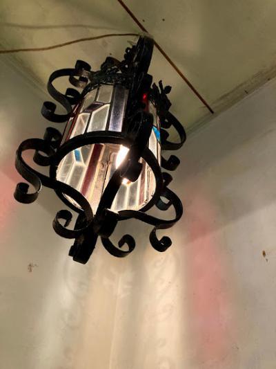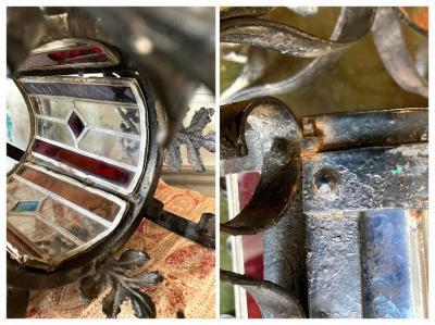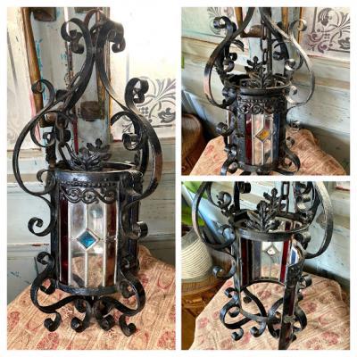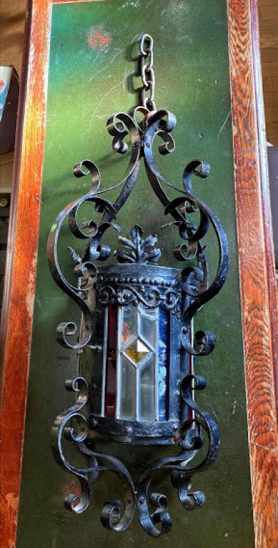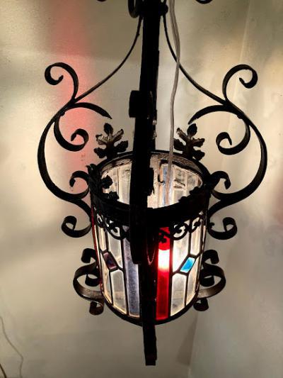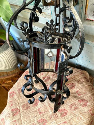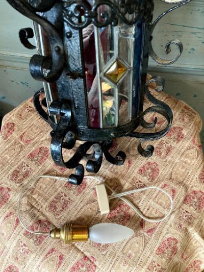 ムーランルージュを思わせるカラフルなステンドガラスを組み込んだシェードです。フランス製。壁面や天井に明るい色が反射して鮮やかな雰囲気を作り出してくれますよ。本体と電球はセットとなりますが、取り付けするときは本体と電球は別々に引っ掛けていただく形となります。本体の黄色いガラス部分は開閉できますが、少し金具が緩んでいます。お試し用の電球を付属(口金E17シャンデリア型)。LED電球にも対応します。古いお品のためペンキの剥がれやサビなどがございます。これらも含めてお楽しみいただける方におすすめ。追加の画像が欲しい方にはLINEまたはメールにてお送りします。お気軽にお問合せください。