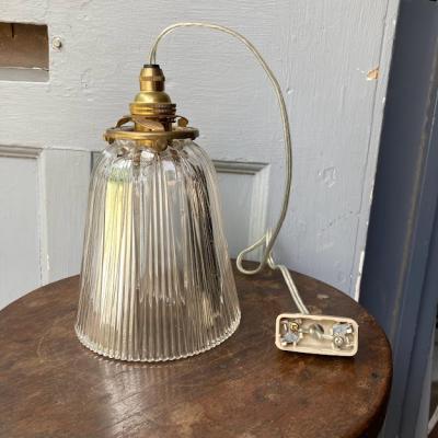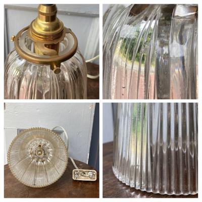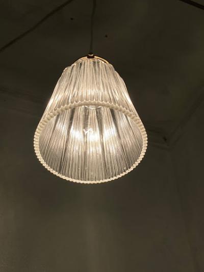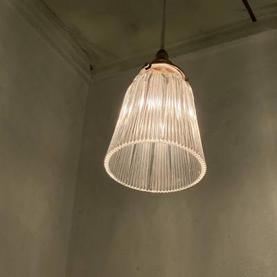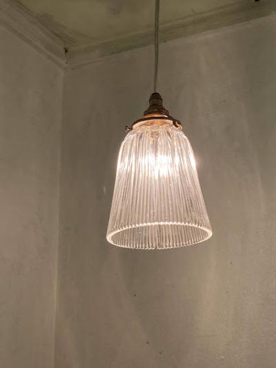 こちらはそこまで古いものではないようですが、美しいため仕入れました。明かりを灯すとカットされたガラスに光がキラキラと反射する様子が、ぱっと目を引く印象です。電球は白熱球・電球色25Wを使用しています。口金サイズは日本で一般的なE17サイズに交換済み、LED電球も取り付けができます。コードの色(ゴールド・ホワイト・ブラウン・クリア)からお好きな色を、長さも1mまではご希望の長さに無料で調整します。引っ掛けシーリングとお試し用の電球も付属しますので届いたその日から楽しむことができますよ。光の反射で見えにくいですが、側面上の方に1か所、約3mmほどの傷が見られます。ご希望がない場合は撮影時使用したコード(クリア)の長さ約50㎝にてお届け。福岡市南区の店舗にてお渡しもできますのでお気軽にどうぞ!
