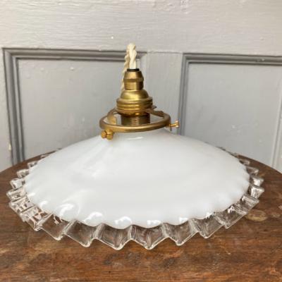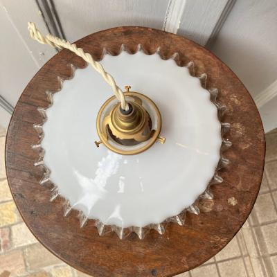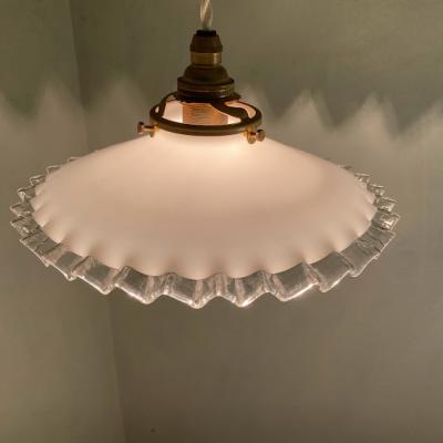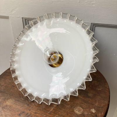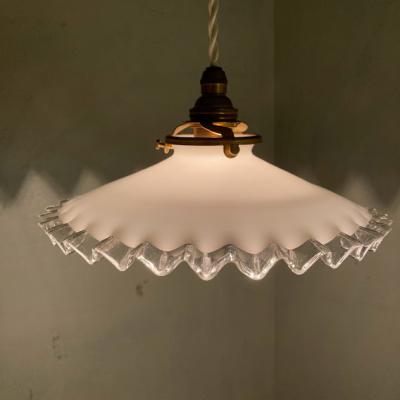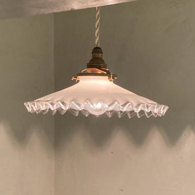白いガラスに透明のフチのフリルが可愛らしいガラスシェードです。古いガラス特有の小さな凹みや気泡、製造時に入り込んだ黒いつぶつぶのようなものが混入していますが、職人が一つ一つ作り上げたフリルの角度やカーブがすべて違うため自分だけのオリジナルのシェードとして楽しめますね。壁に映るシルエットも絵になりますよ。こちらはすぐにご利用ができるように引っ掛けシーリング・コード・お試し用の電球(25W)を付属します。写真の電球は口金E17サイズの25W(クリア)を使用、LED電球も使用できるソケットです。コードの長さは店舗用に約50㎝くらいの長さでご準備しておりますが、お部屋の雰囲気に合わせて、ゴールド・ホワイト・ブラウン・クリアコードの色と長さをお選びいただけます。長さ調整は1mまでは無料で調整いたしますが、1m以上は追加で料金が発生しますので、事前にお問合せください。推定1930年~40代頃のお品となりますので、細かな傷や落ちきれない汚れがある場合がございます。古いものが好き!シャビ―シックなお部屋作りを楽しんでいる!ピカピカの新品よりはレトロな雰囲気のものが好き!という方におすすめです。新品をお求めの方はご遠慮ください。同じデザインの商品複数ございます。店舗オープンなどにご利用の方へのご準備もできますのでお問合せください。