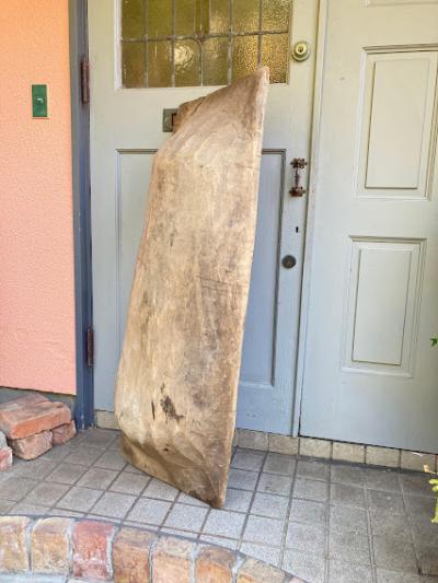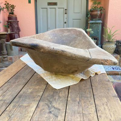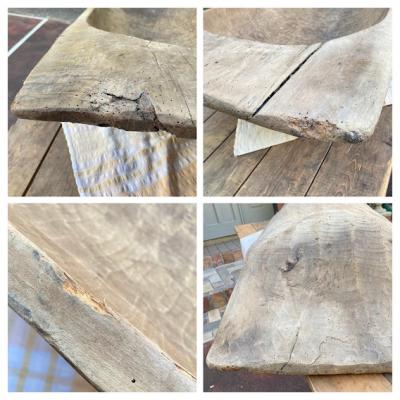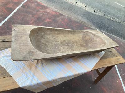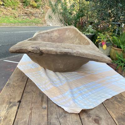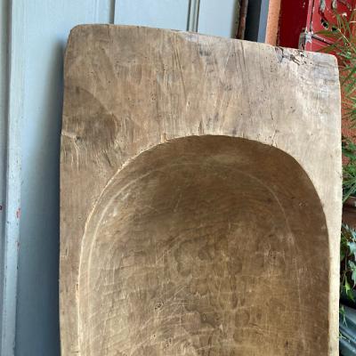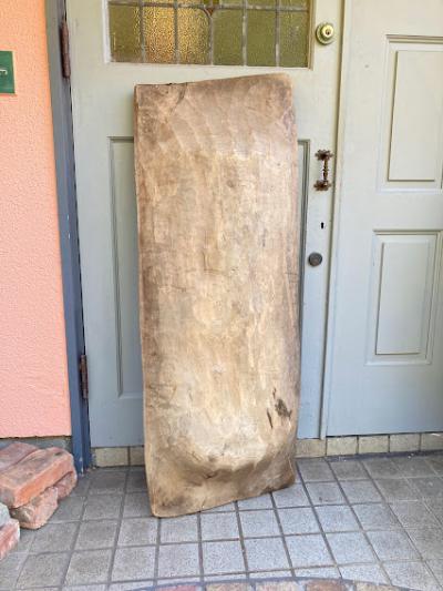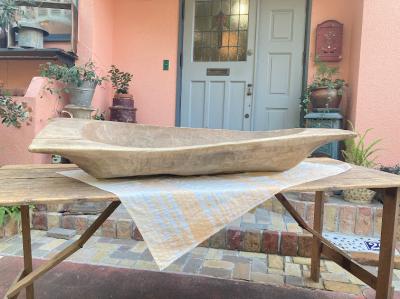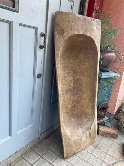 手彫りのボコボコした風合いが素敵な約130㎝ほどもある大きなこね鉢。道具がそこまで発達していないであろう時代に1本の大きな丸太からくり抜かれた不均等な様子が味わいのある佇まいに。フランス製、推定1950年代。虫食いの跡や傷などはありますが、しっかりとした厚みが安心感を感じさせてくれます。こね鉢としてのご利用よりは、果物やお花、観葉植物など、ディスプレイ什器としてご利用ください。傷や凹凸虫食い跡を楽しめる方、古道具の持つ時代を感じる雰囲気がお好きな方、展示会などでインパクトのある表現を行いたい方、おうち時間よより充実させたい方などにおすすめ。ピカピカの新品をお求めの方はご遠慮ください。力のある方であれば一人での移動可能。