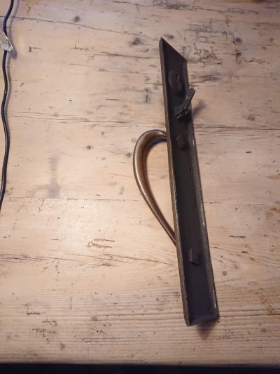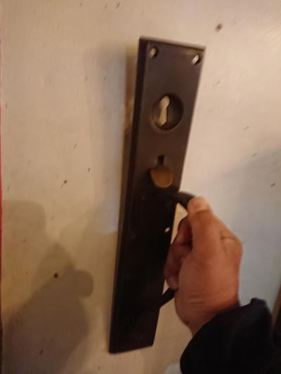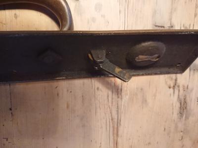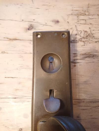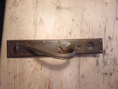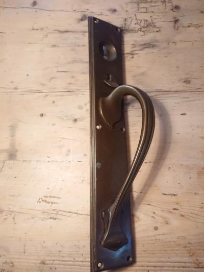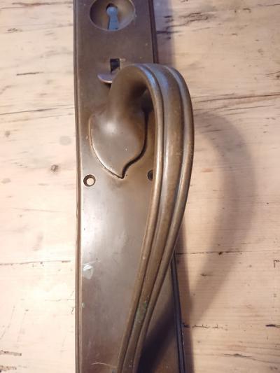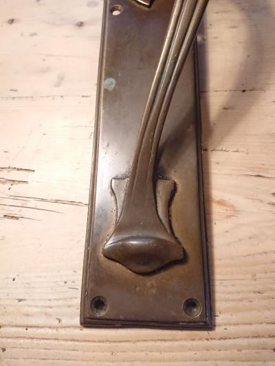 アールヌーボーデザインの真鍮ドア取手。ずっしりとした重量感があり、ドアの雰囲気を格上げしてくれそうですね。鍵穴下のボタンのようなものは裏側にレバーのようなものが付いており、ドアの鍵として連動していたようです。上下に動きますが、平面に取り付ける際には穴をあけるなど少し工作が必要となります。せっかくオリジナルの品なので取り外さずにこのままにしております。取り付けの際にはご自身の契約されている施工業者さまにお問合せください。古いお品のため独特の錆、変色、擦り傷があります。アンティークの風合いがお好きな方におすすめ。ピカピカの新品をお求めの方はご遠慮ください。
