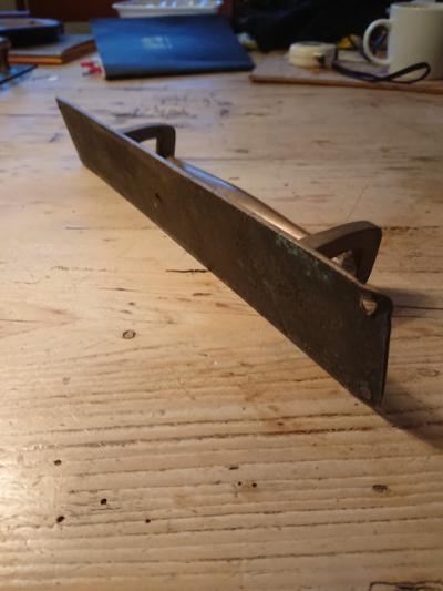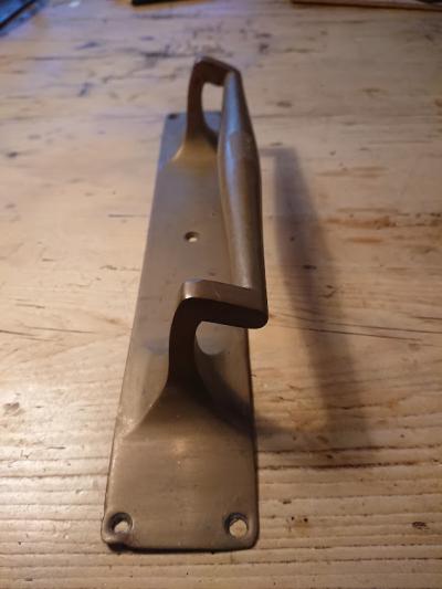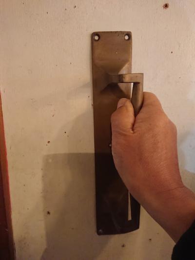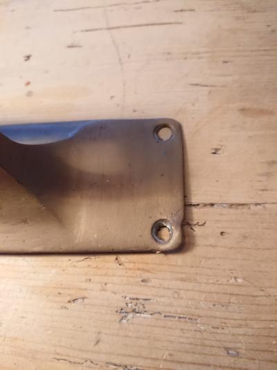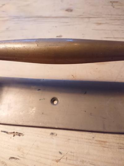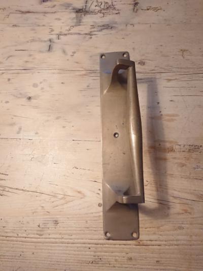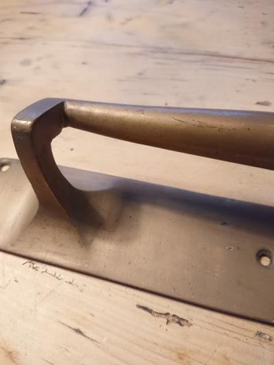 真鍮ドア取手。長きに渡り使用された歴史を感じる風合いがいいですね。ねじ穴1か所にほんの少し変形があります。福岡市南区の店舗にてお渡しもできますのでお気軽にどうぞ!