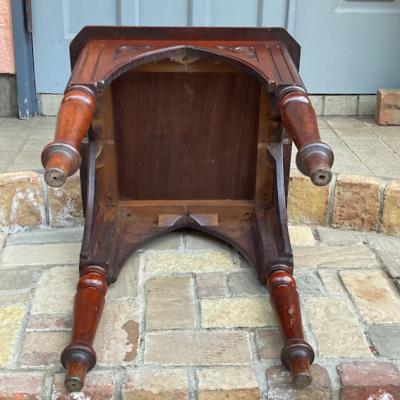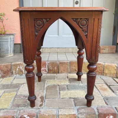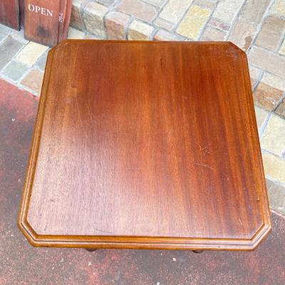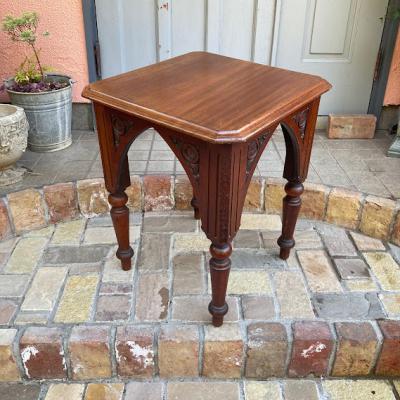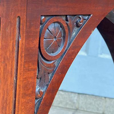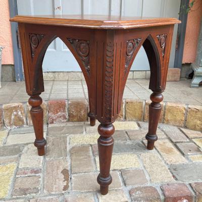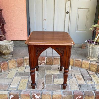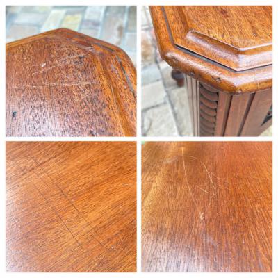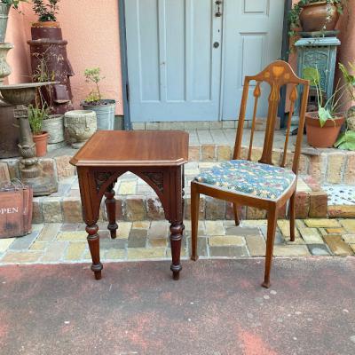 側面の彫刻がどの角度から見ても美しいマホガニーのテーブル。大きすぎないサイズ感はいろいろな場所で活躍しそうですね。一般的な高さの椅子と撮影した画像を参考にされてください。小さな傷や凹みなど古いお品特有の風合いはございます。くっきりと刻まれた歴史を感じるデザインがお好きな方、古い重厚感のある雰囲気がお好きな方におすすめ。ピカピカの新品をお求めの方はご遠慮ください。福岡市南区の店舗にてお渡しもできますのでお気軽にどうぞ!