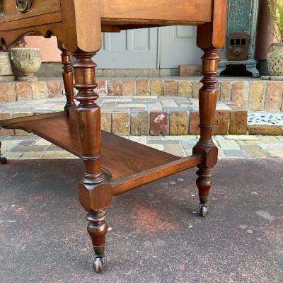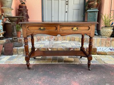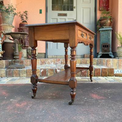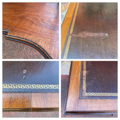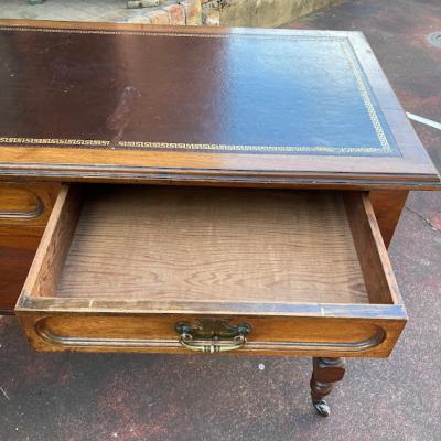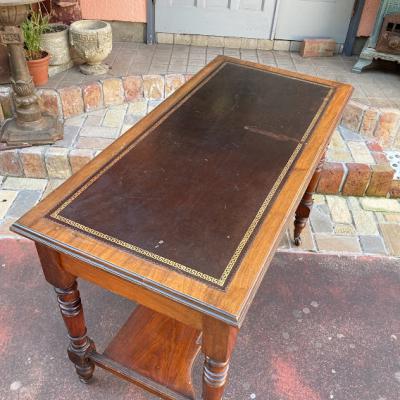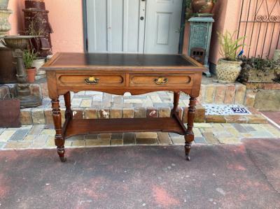 ブラウンのレザーに金彩を施した美しいテーブルです。マホガニー。推定1930年代。大きめの引き出しが2つ付属しているため小物の収納に便利ですね。古いお品のため経年劣化による傷などはございます。これらも含めてお楽しみいただける方におすすめ。店舗などではお洒落なディスプレイ什器としても。ピカピカの新品をお求めの方はご遠慮ください。福岡市南区の店舗にてお渡しもできますのでお気軽にどうぞ!