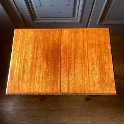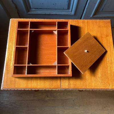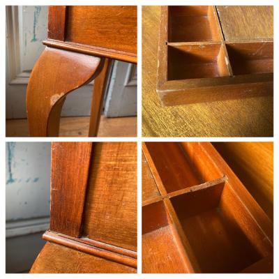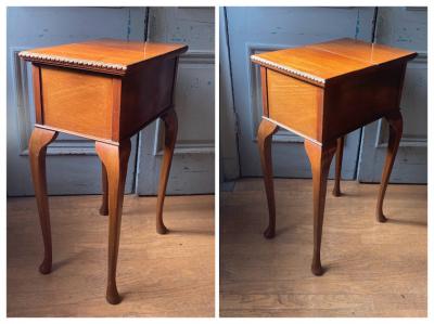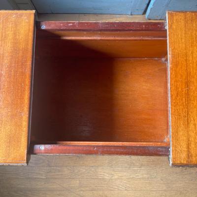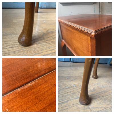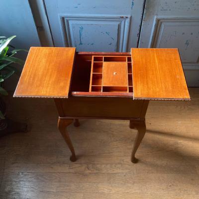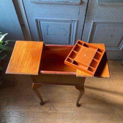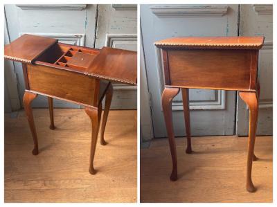 マホガニーの艶やかな天板を左右にスライドさせると小さなパーツを収納できる箱が付属しているソーイングボックスです。仕分け用の箱は取り外しができます。天板の下は細々としたものを収納できるので、お部屋のちょっとしたサイドテーブルとしても便利ですよ。文化の違いではございますが、イギリスでは経年劣化による小さな傷や凹みなどは長きに渡り持ち主を支えた勲章として慈しみ、風合いを楽しみながら育てていくのだそうです。物を大切に使い続ける素敵な文化ですね。こちらのお品もしっかりと持ち主を支えた小さな傷や凹みがございます。発送前に再度クリーニングを行った後にお届けしますが、時代を感じるお品であることをご了承ください。ピカピカの新品をお求めの方はご遠慮くださいませ。福岡市南区の店舗にてお渡しもできますのでお気軽にどうぞ!