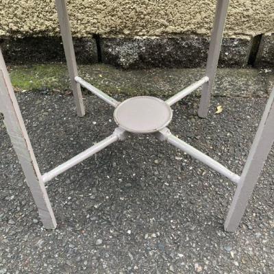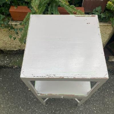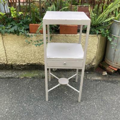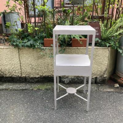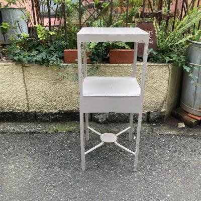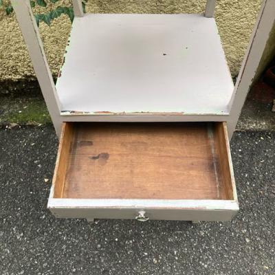 元はライムグリーンのペイントを施してあったようですが、ライトグレーに塗り重ねてある2段の飾り棚です。所々にペイントの剥がれがあり、それらがいい風合いになっています。フランス製パイン、推定1930年代とのこと。小さな引き出しが付属しているので小物をまとめるのに便利ですね。お花や観葉植物を置いても、お店ではレジ横のディスプレイ什器としても素敵な佇まいです。小ぶりで移動が簡単なのでちょっとした場所で活躍しそう。ご覧いただけるとおり、ペイントの剥がれ、天板にはほんの少し木が出ている部分もありますが、これらも含めてお楽しみいただける方におすすめします。ピカピカの新品をお求めの方はご遠慮ください。福岡市南区の店舗にてお渡しもできますのでお気軽にどうぞ!