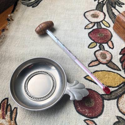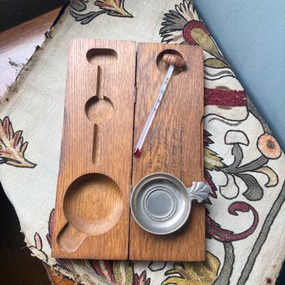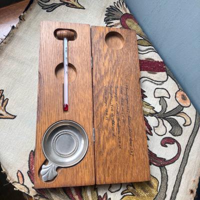 フランス語でシャンパンやワインの飲み頃の温度が記されている重厚感のあるオークの材の木箱に入った温度計セット。温度計の赤い部分を温めるとゆっくりと温度は上がっていきましたが、正確なのか確証がありませんのであくまでもディスプレイ用としてお楽しみくださる方に。専用の木箱にピタリとおさまります。お酒がお好きな方や飲食店などでインテリアの小物をお探しの方におすすめします。福岡市南区の店舗にてお渡しもできますのでお気軽にどうぞ!