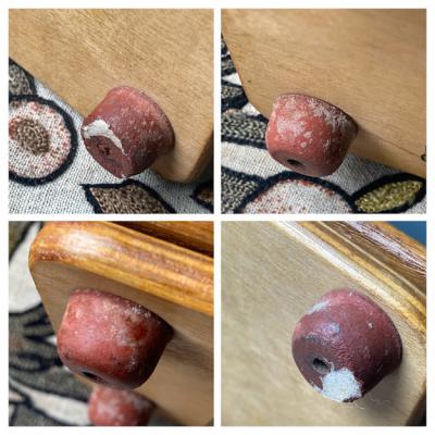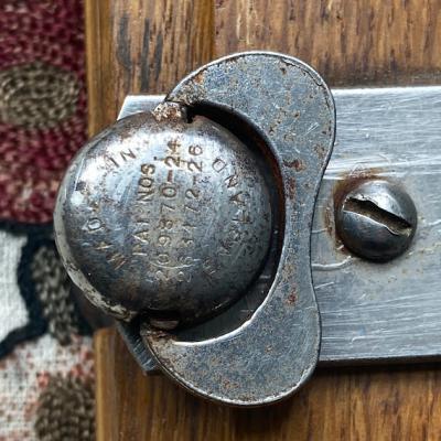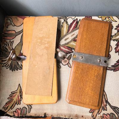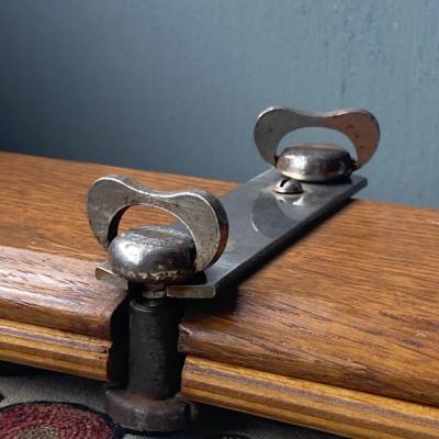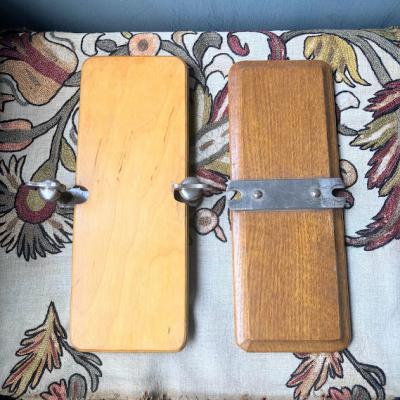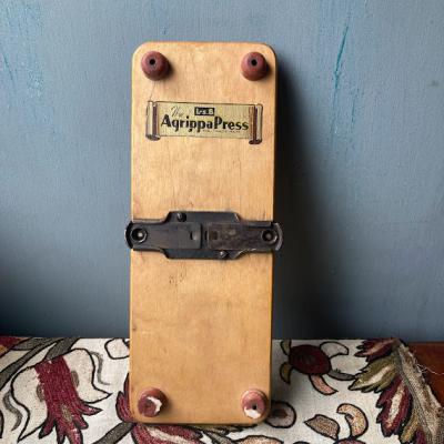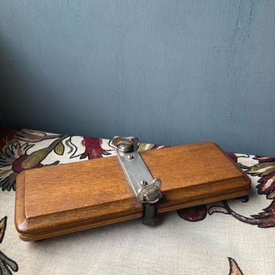 イギリス「Agrippa Press」のタイプレスです。日本のズボンプレッサーのネクタイ版と思っていただけたら分かりやすいかもしれません。左右のネジを緩め、金具を外側にスライドすると上下2つに分かれますので、その間にタイを挟むようです。専用の道具を作るとは何とも優雅ですね。木材部分はしっかりとしたオークとのこと。押し花などを作る方もいらっしゃるとか。金具の部分にMADE IN ENGLANDのロゴと製造番号のような数字が刻まれています。裏面の脚の部分のゴムに凹みと少し劣化があります。これの風合いも含めて古い道具がお好きな方、押し花を楽しみたい方におすすめ。ピカピカの新品をお求めの方はご遠慮ください。こちらは送料無料でお届けします。