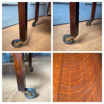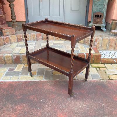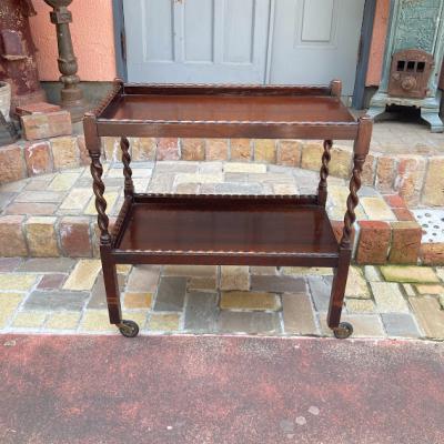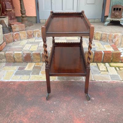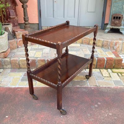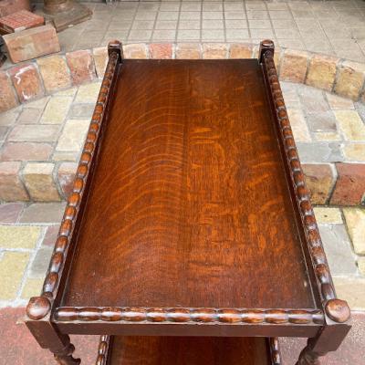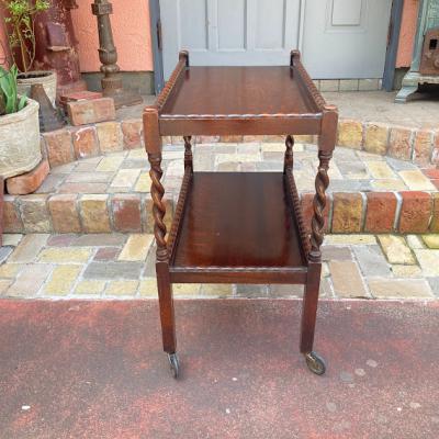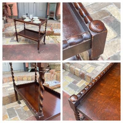 ツイストレッグのキッチンワゴン(ティートロリー)。キャスターが付属しているので移動も楽々です。食事やお茶を運んだり、キッチンワゴンとして利用しても便利ですね。上下2段あるのでディスプレイ台などにも使えそうです。推定1930年代、オーク材。アンティークらしく経年による傷や凹凸が見られます。多くの人に愛され使われ続けた証ですね。発送前に再度メンテナンスを行いますが、多少の風合いはありますのでしっかりと画像をご確認の上、ピカピカの新品をお求めの方はご遠慮ください。福岡市南区の店舗にてお渡しもできますのでお気軽にどうぞ!