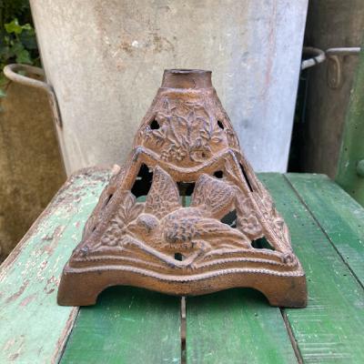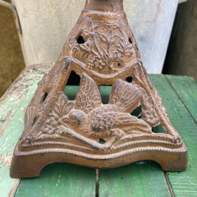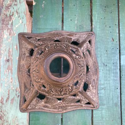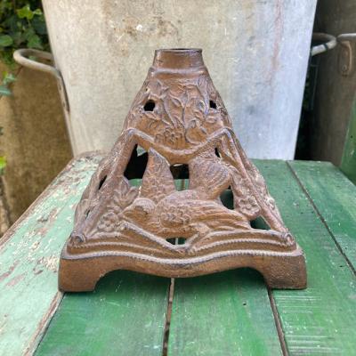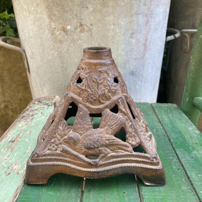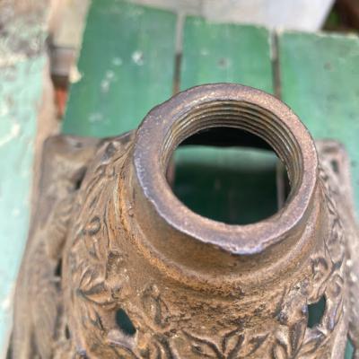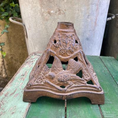 アールヌーボーの鳥モチーフで推定1900年代アイアンのランプベース(オイルベースなどとも呼ばれます)。オイルランプなどの土台そして使用されていたものとなります。別のランプと比較していますのでその画像をご覧くださいね。こちらは柔らかな曲線に小鳥と植物を物を組み合わせた優しい雰囲気のデザイン。上部にランプと連結できるようにネジ式の穴が開いています。ランプベースとしてのご利用はもちろんのこと、このアイアンの風合いを生かしてグリーンを飾っても素敵ですし、中に電球を灯してオリジナルのランプシェードとしても。風合いを残すため軽く拭き上げのみとなります。ピカピカの新品をお求めの方はご遠慮ください。福岡市南区の店舗にてお渡しもできますのでお気軽にどうぞ!