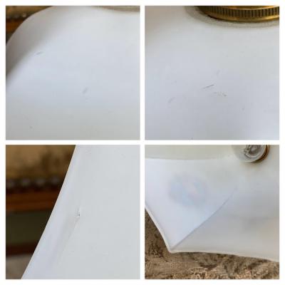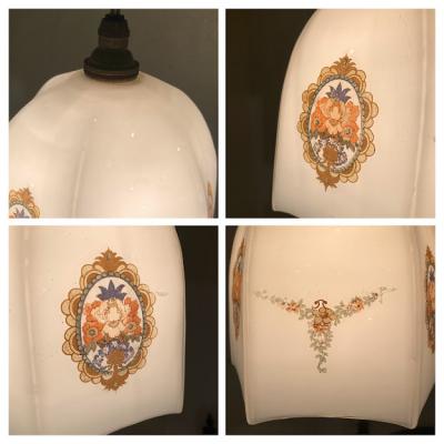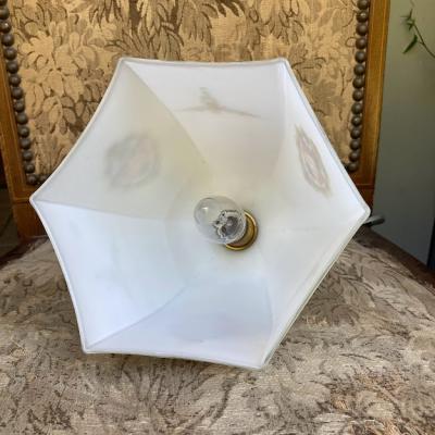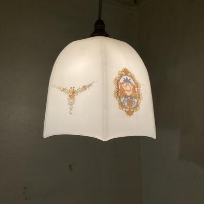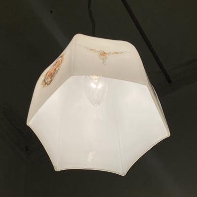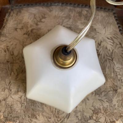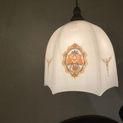 白いガラスに優しいお花がデザインされた六角形の照明。お部屋を柔らかな光で包み込んでくれそうですね。大きな割れなどはありませんが、古いガラス特有の不純物や小さな傷があり風合い豊かな佇まいです。撮影には口金サイズE17のクリア・電球色・25Wを使用しました。LED電球使用できます。コードはホワイト・ゴールド・ブラウン・クリアの4色からお好きな色に交換可能。長さは1mまでは無料で調整しますので、ご希望の長さをお申し付けください。ご希望がない場合は撮影時と同じコード色:クリア、長さ約50㎝にてお届けします。優しい雰囲気のお部屋作りを楽しんでいらっしゃる方、古い照明を使ってみたい方などにおすすめ。
