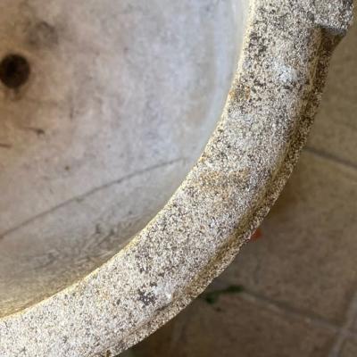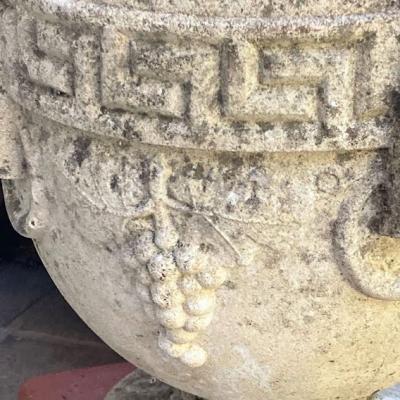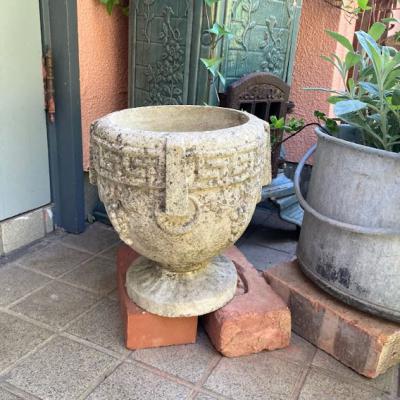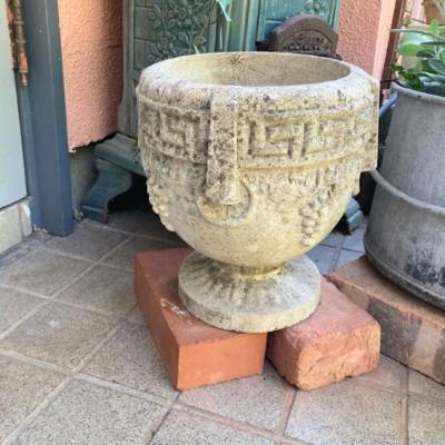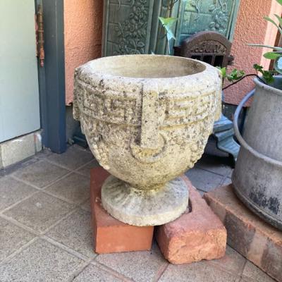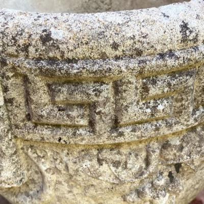 イギリスの推定1980年代の古いセメント鉢。ぶどうとグリーク(ローマンキー)と呼ばれる雷文の模様がくっきりと施されでいます。底に水抜きの穴が開いていますので、お気に入りの植物を寄せ植えしても素敵ですね。写真の通りの独特なたたずまいですが、大きな割れなどはありませんでした。同じデザインの物も在庫がありますが、こちらは比較的白く見える方【P2】となります。側面を包み込む黒っぽい部分は、これからさらに時代を経ていい風合いへ変わっていくと思われます。ガーデニングがお好きな方、古い雰囲気のディスプレイ雑貨などをお探しの方におすすめ。