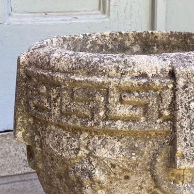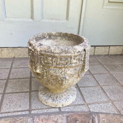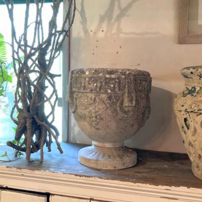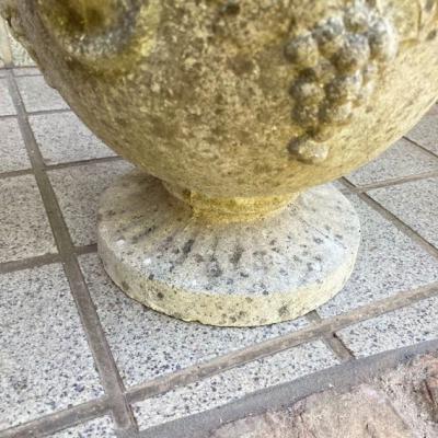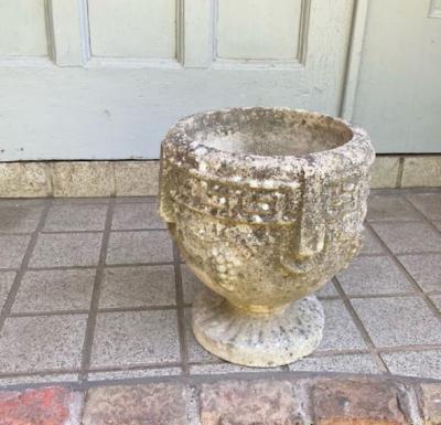 イギリスの推定1980年代の古いセメント鉢。ぶどうとグリーク(ローマンキー)と呼ばれる雷文の模様がくっきりと施されでいます。底に水抜きの穴が開いていますので、お気に入りの植物を寄せ植えしても素敵ですね。写真の通りの独特なたたずまいですが、大きな割れなどはありませんでした。同じデザインの物も在庫がありますが、こちらは少し黒っぽく見える【P1】となります。側面を包み込む黒い部分は、これからさらに時代を経ていい風合いへ変わっていくと思われます。ガーデニングがお好きな方、古い雰囲気のディスプレイ雑貨などをお探しの方におすすめ。