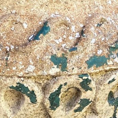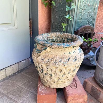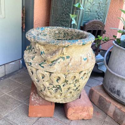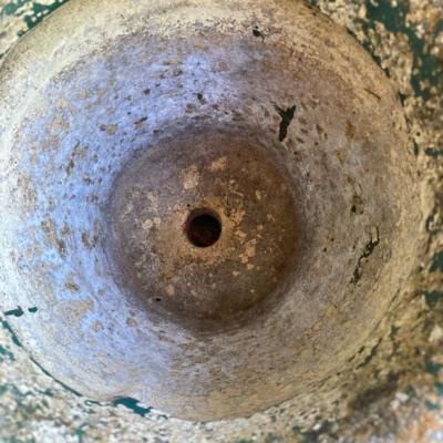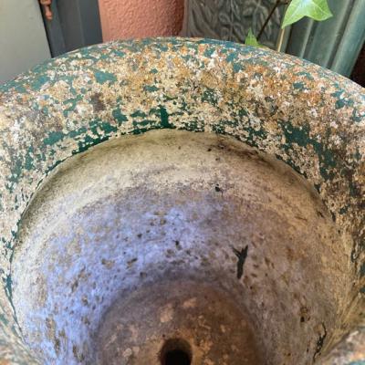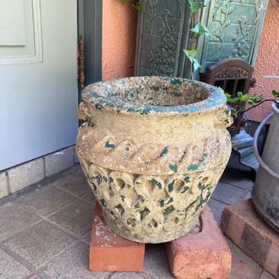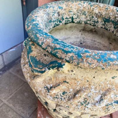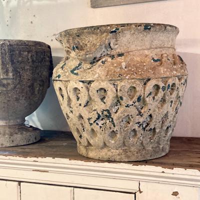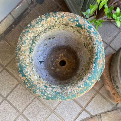 イギリスの推定1980年代の古いセメント鉢。深く刻まれた模様の所々に緑色のペイントが残っておりいい風合いに仕上がっています。底に水抜きの穴が開いていますので、お気に入りの植物を寄せ植えしても素敵ですね。写真の通りの独特なたたずまいですが、大きな割れなどはありませんでした。今でも十分に素敵な佇まいですが、これからさらに時代を経て変わっていくと思われます。約14キロとやや重さがありますので移動の際には足元にお気をつけください。ガーデニングがお好きな方、古い雰囲気のディスプレイ雑貨などをお探しの方におすすめ。福岡市南区の店舗にてお渡しもできますのでお気軽にどうぞ!