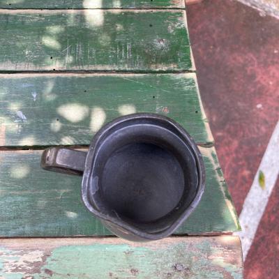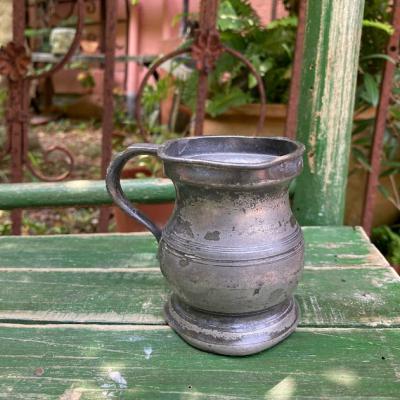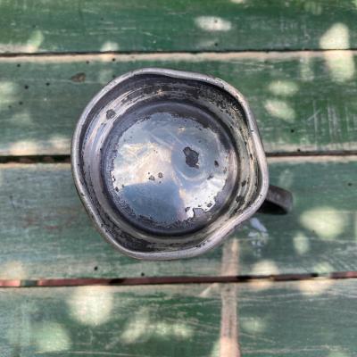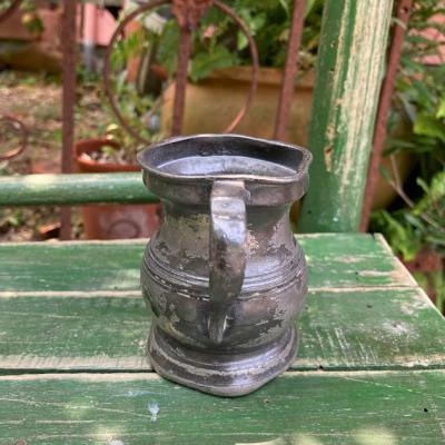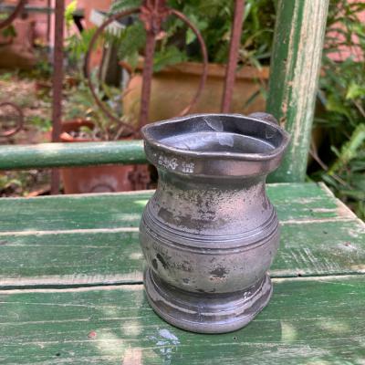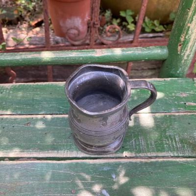イギリスの味わい深いピューターカップ。お酒などを測るときに使われていたものだそうです。フチの部分に刻印のようなものあり。ピューターは18世紀から19世紀にわたりスズを主体とした合金で、特有の柔らかさゆえに凹みや変形がおきるのが特徴ですが、それらがオリジナルの形状を作り出し楽しむことができるものとなります。写真の通りぐにゃっと曲がった部分や凹みの部分がこの商品の良さとなります。古いものがお好きな方、長い時代を経てなお変化し続けるものがお好きな方におすすめ。ピカピカのものをお求めの方はご遠慮ください。