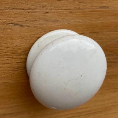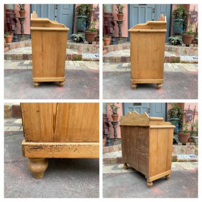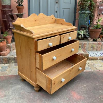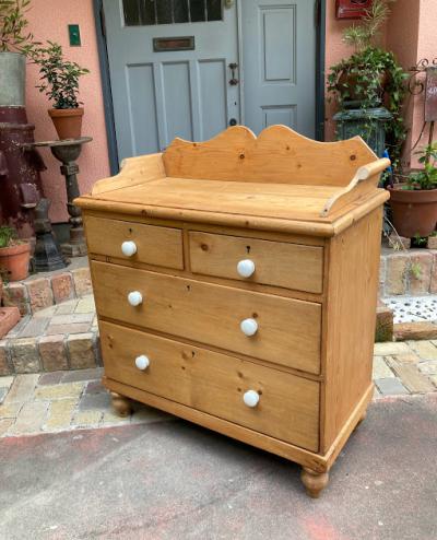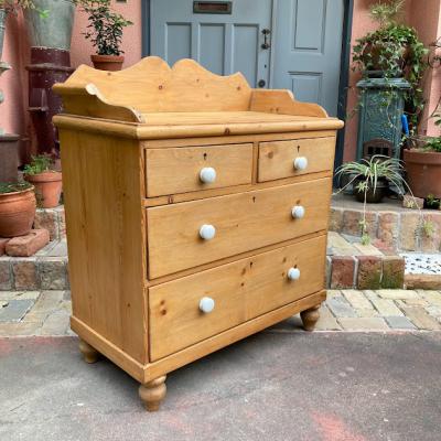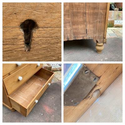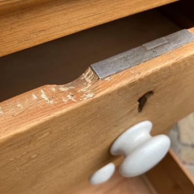 大きな引き出しのパインチェスト。上段には左右2つの引き出しに分かれています。容量もたっぷりでいろいろと収納してくれそうですね。高さが約84㎝ほどになりますので、天板の上にお好きな小物を飾ったり、テレビ台や店舗などのレジ台としても活躍してくれそうです。白い取手が可愛らしいアクセントになっておりますが、古い陶器特有の貫入がうっすらと入っています。感じ方に個人差がありますが、引き出し内にうっすらと香水?柔軟剤?のような香りがする場合があります。できる限り換気を行いますが、香りに敏感な方はご注意ください。それぞれの引き出しに鍵穴がありますが、鍵はありません。木の優しい雰囲気がお好きな方やパイン材特有の虫食い跡などもデザインとして楽しめる方におすすめ。福岡市南区の店舗にてお渡しもできますのでお気軽にどうぞ!