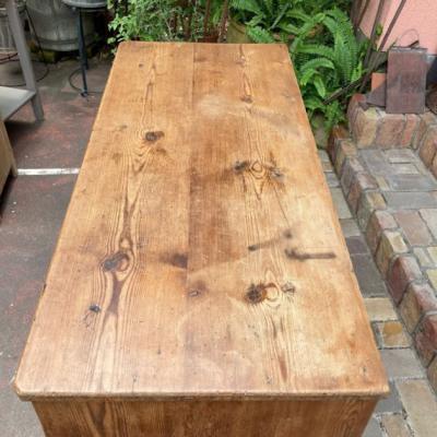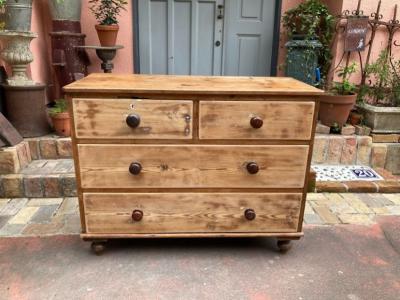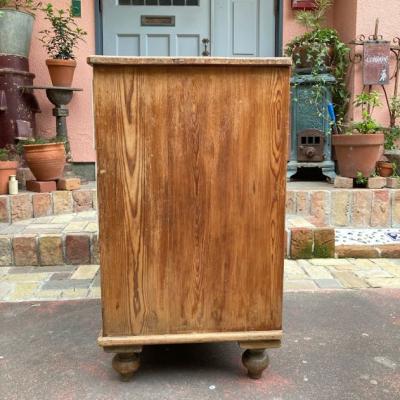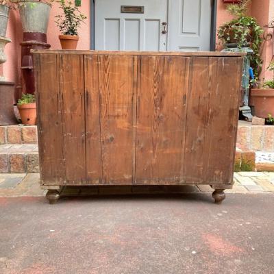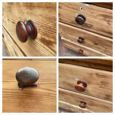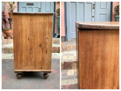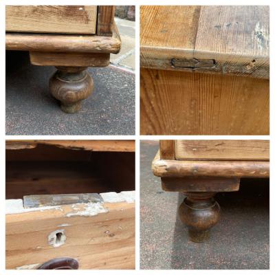 オールドパインの美しい大きなチェスト。裏面にもしっかりとパイン材を使用してあるのに加え、しっかりとした造りの4つの脚で安定感があります。深さのある引き出しは多くの物を収納できそうですね。正面から見て左手側奥の天板が経年劣化によりほんの少し反っていますが、ご使用には支障のないレベルですが、背面画像にてご確認ください。引き出しの正面は白くペイントされていたようですが、元の色に剥がしてあり、2段目の引き出し左側のつまみの下に少し欠けている部分があります。正面からはあまり見えない箇所になります。1段目左側の引き出しに鍵穴がありますが、鍵はありませんでした。あくまでも飾りととしてお考えください。ビクトリア時代の重厚感のあるパインはアンティークらしい風合いはありますが、お部屋の雰囲気を一段上に引き立ててくれそうです。たっぷりとした収納をお探しの方や、雰囲気のある店舗用の陳列棚をお探しのにおすすめ。やや大きめのサイズとなりますので、搬入予定の場所に入るかサイズをしっかりとご確認ください。福岡市南区の店舗にてお渡しもできますのでお気軽にどうぞ!