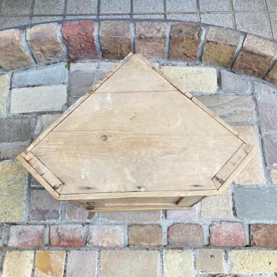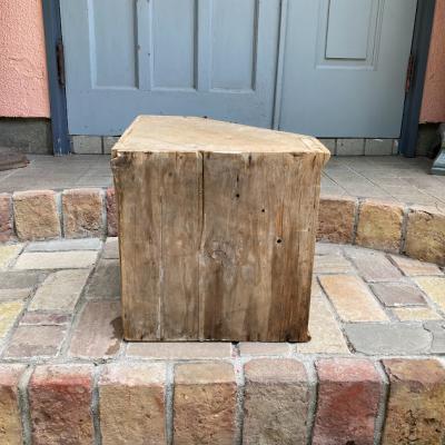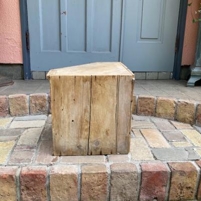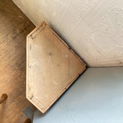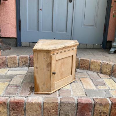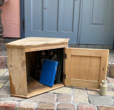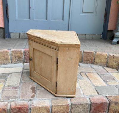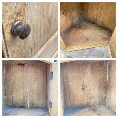小さなオールドパインのコーナーキャビネット。直角になっているためデッドスペースを有効活用できて便利ですね。こちらのキャビネットもコーナーに直接ねじ止めして固定されていたようで、背面に穴が数か所開いています。正面の扉を開けると高さA4サイズの本を入れることもできました。匂いの感じ方に個人差はありますが、ほんのり香料のような香りが残っています。正面向かって左側には水にぬれたような跡が見えますが、これはオイル?のようなもので取れません。このままの状態でお届けになります。雰囲気のある棚をお探しの方におすすめ。ピカピカの新品をお求めの方はご遠慮ください。福岡市南区の店舗にてお渡しもできますのでお気軽にどうぞ!