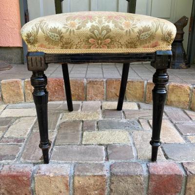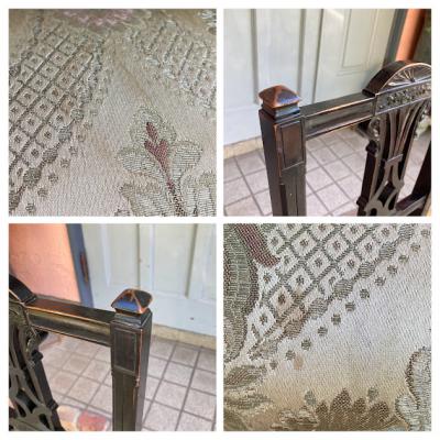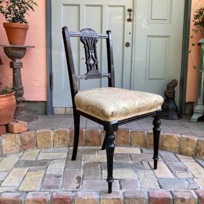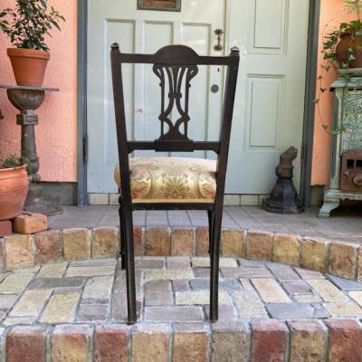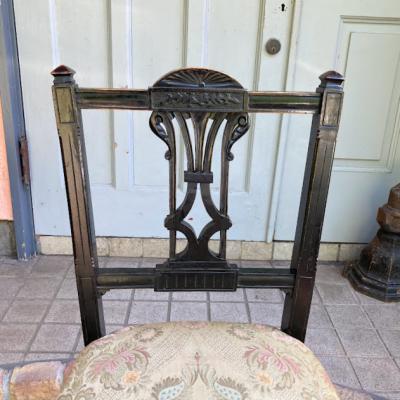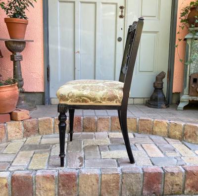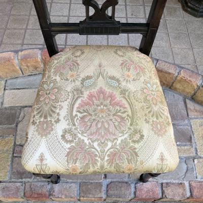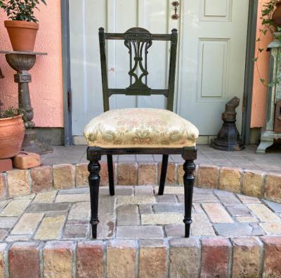 すっきりとした黒いペイントに美しい刺繍の座面が美しいフランス製の椅子。何も手を加えずオリジナルの状態です。座ってみましたが、まだまだ現役でご利用できるかと思います。座面の表面にはうっすらとシミのような箇所がありますが、デザインと一体化しているためあまり目立ちません。玄関などにちょっと置いてもいいですね。アンティークらしい経年による風合いはもちろんございますので古い家具に魅力を感じる方におすすめ。ピカピカの新品をお求めの方はご遠慮ください。福岡市南区の店舗にてお渡しもできますのでお気軽にどうぞ!