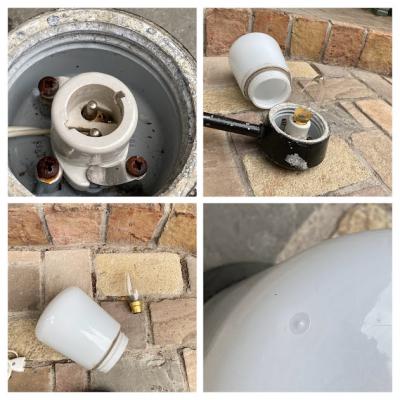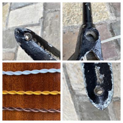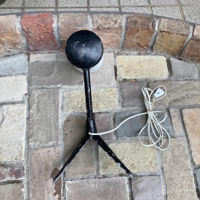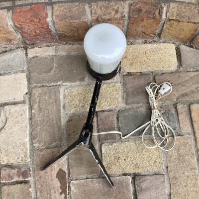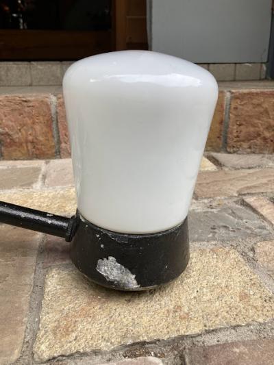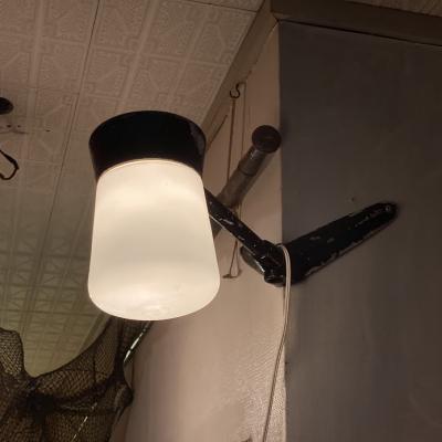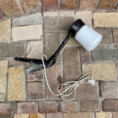 面白い形の壁掛け照明。壁にピタりと沿うような形になっています。恐らく専用の場所に設置するために作られたのではとのことでした。白いガラス部分をねじって外すと、海外仕様のピン式電球(B22サイズ)付属。点灯確認を行うために仮のコンセントを付けてあります。壁に取り付けるV字の部分にはねじ穴が2か所開いており、しっかりと壁に固定ができました。また、V字部分付け根の下部分には穴が開いています。リフォームやリノベーション、店舗什器などの場合は壁の中に配線を行うほうがきれいに設置できそうですね。コードの長さは1mまでは無料でお好きな色に交換できます。壁の中に配線を行う方につきましては、現在付属している長めのコードをそのまま付属できます。(長さ約250㎝ほどの中古ケーブル)ご注文時にお知らせください。周りの黒い塗装部分は古びた風合いがあります。形が変則的なため、計測した部分を写真に記載してあります。参考にされてください。独特のたたずまいに魅力を感じる方、ビンテージ感のある雰囲気がお好きな方におすすめ。ピカピカの新品をお求めの方はご遠慮ください。福岡市南区の店舗にてお渡しもできますのでお気軽にどうぞ!