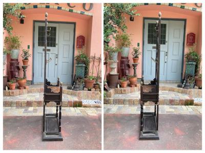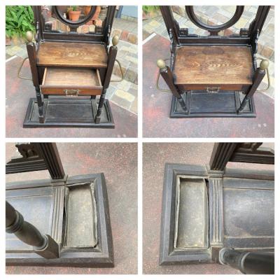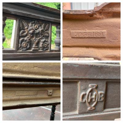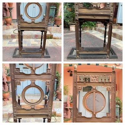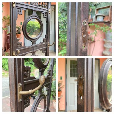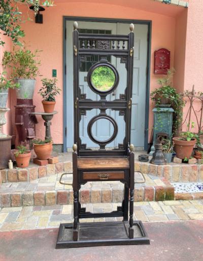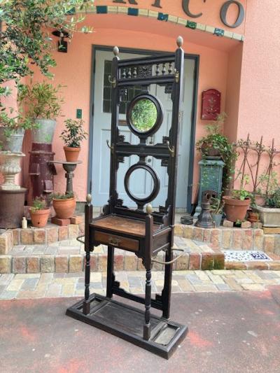 珍しい鋳物と木材+真鍮の組み合わせのホールスタンド。かつてのイギリスでは限られたスペースで身だしなみを整えるためにステッキ立て、帽子、コートなどを掛けることができるこのようなスタンドを利用していたそうです。両サイドのステッキ立ての下に滴受けのお皿も設置されているため傘立てとしても活用できそうですね。真ん中の引き出しには毎日利用する財布や鍵、荷物受け取り用の印鑑などを収納するのにも便利そうです。引き出しとその天板部分のみオーク材、それ以外の部分が鋳物のためかなりの重量(約40キロほど)があります。大人2人以上で設置を行ってください。裏面に「R●56169」の番号が刻印されています。上下の組み合わせが間違えないように記されているのではとのことでした。木製のものとは違い、鉄特有の風合いが独特な佇まいです。ご自宅はもちろんのこと、店舗什器としてもカッコいいですね。鏡は上のみ付属していました。左右2か所フックと取り外した跡があります。推定1870年代。歴史をしっかりと感じる家具をお探しの方におすすめ。サビや当時のままの凹みなどはそのままにしておりますので、ピカピカの新品をお求めの方はご遠慮ください。福岡市南区の店舗にてお渡しもできますのでお気軽にどうぞ!