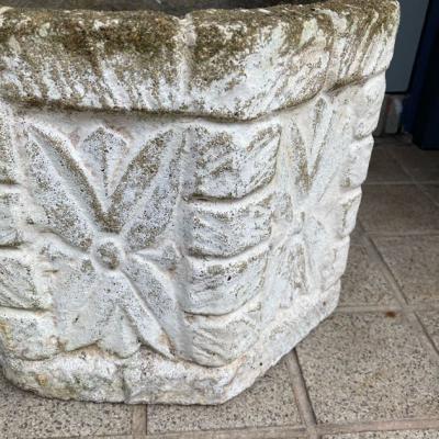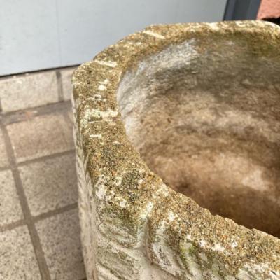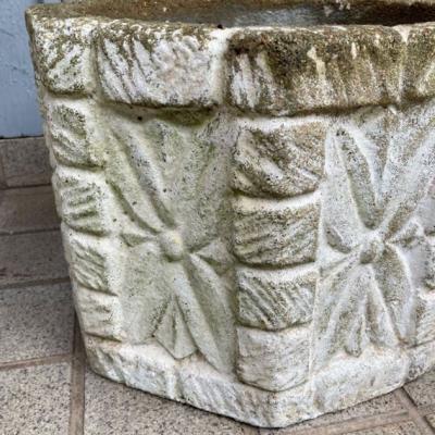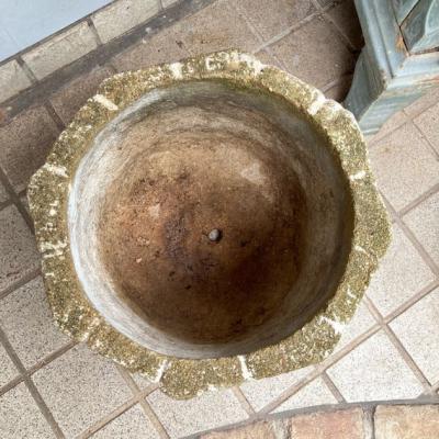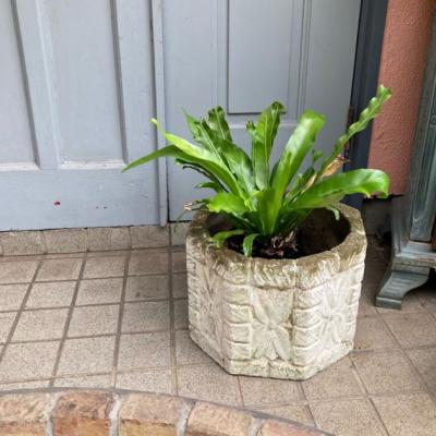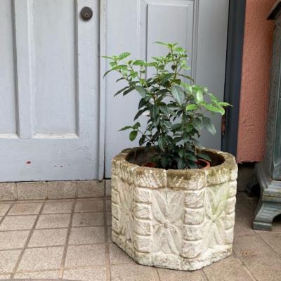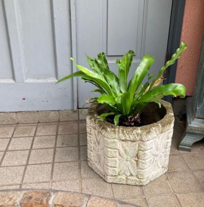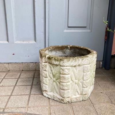 イギリスの古いセメント鉢。推定1980年代とのこと。レンガを積み上げたようなデザインの中央には大きなお花のモチーフが刻まれており可愛らしい雰囲気。底に水抜きの穴が1か所開いていますので、お気に入りの植物を寄せ植えしてもいいですし、鉢カバーとしても素敵ですね。写真の通りの独特なたたずまいですが、大きな割れなどはありませんでした。フチの部分は経年による色の変化もあり今でも十分に素敵な佇まいですが、これからさらに時代を経て変わっていくと思われます。約18キロとやや重さがありますので移動の際には足元にお気をつけくださいね。ガーデニングがお好きな方、古い雰囲気のディスプレイ雑貨などをお探しの方におすすめ。福岡市南区の店舗にてお渡しもできますのでお気軽にどうぞ!※撮影に使用した植物は付属しません。