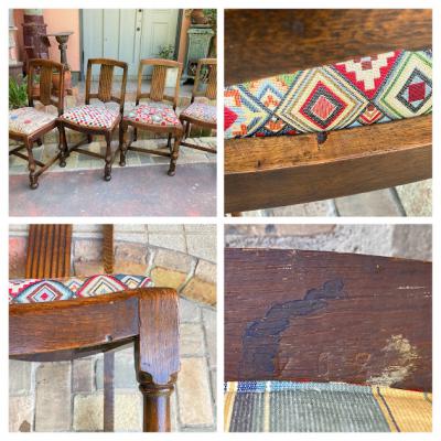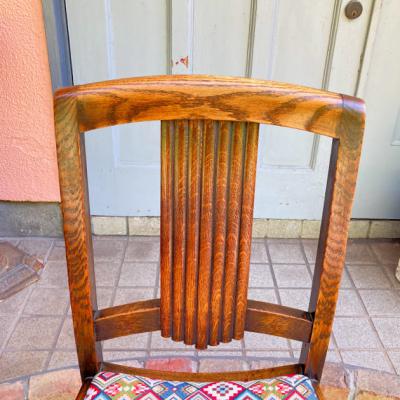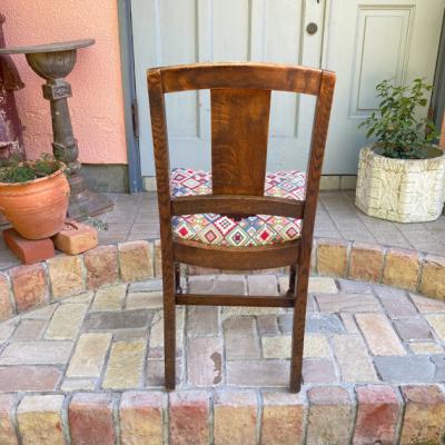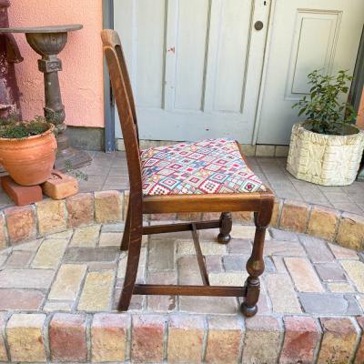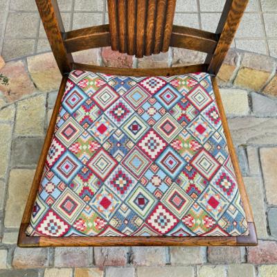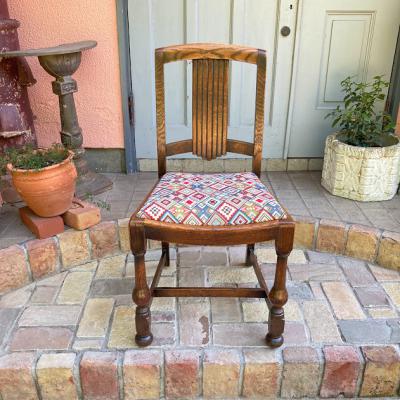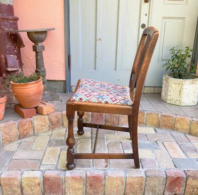 オーク材のダイニングチェア。座面はイギリスのカラフルなダイヤ柄の生地に張替えて調整済み。シンプルなオークのデザインとカラフルな座面がお部屋を明るく照らしてくれそうですね。裏面のすみに数字の694の刻印がありました。裏面生地はオリジナルの物を再利用してあります。大きな傷やガタツキはなくすぐにご利用できます。同じ形で座面の柄違いがありますので、いろいろな組み合わせも楽しいですよ。推定1930年代。底のフェルトは現地で後付けされたもののようです。必要ない場合は外してお届けもできますのでお気軽にお申しつけください。福岡市南区の店舗にてお渡しもできますのでお気軽にどうぞ!