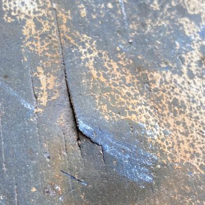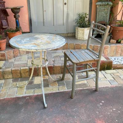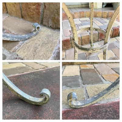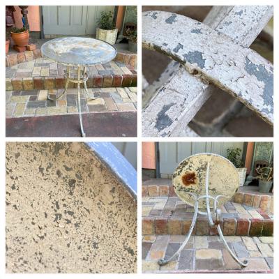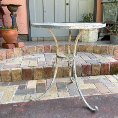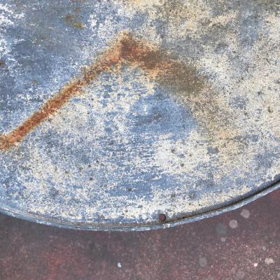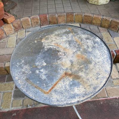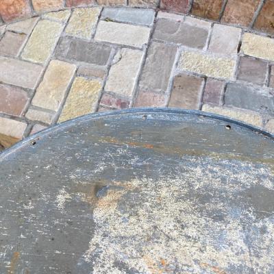 天板に水はけをよくするための穴が4カ所開いているガーデンテーブル。片方に3個・もう片方に1個開いています。フランス製。年代は不詳ですが、剥がれ落ちたペイントやサビの風合いが長い月日を過ごしたことを表しています。土台部分もしっかりとしていますので、お庭でお茶を楽しんだり、植木鉢を飾ってもいいですね。お届けする前に軽くクリーニングを行いますが、その際に白いペンキが剥がれる場合がありますので予めご了承ください。ご覧いただける通り、天板には傷や剥がれ等ございます。使い込まれた雰囲気がお好きな方向き。ピカピカの新品をお求めの方はご遠慮ください。福岡市南区の店舗にてお渡しもできますのでお気軽にどうぞ!※撮影に使用した椅子は付属しません。椅子の座面高さは約47㎝の一般的なサイズの椅子を使用しています。