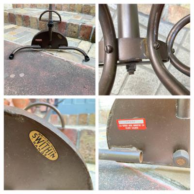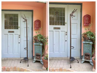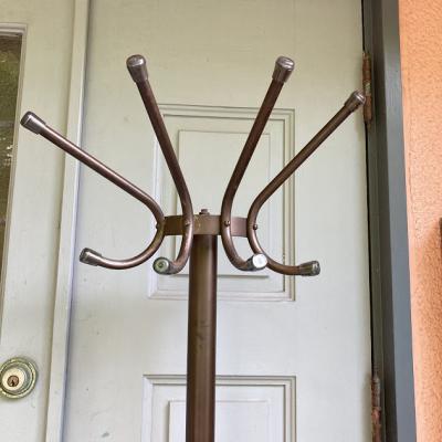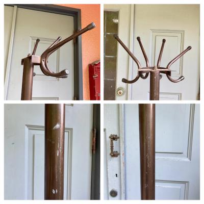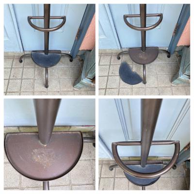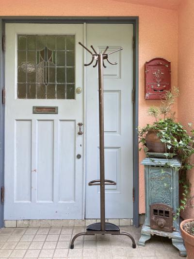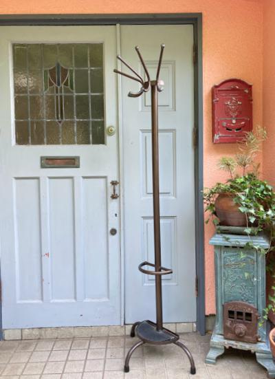 すっきりとしたデザインのホールハンガー。BRITISH MADE SWITHIN RANGEのシールが残っておりお部屋に馴染むブロンズカラー。LONDONにあるストリートの名前のロゴとシリアルNO00340が入っていたのでお店用の商品として使用されていたのではとのことです。半円形のデザインのため壁に付けて設置できスペースの有効利用ができますね!先端のゴムパッキンが劣化でボロボロだったので、露出部分でのケガを考慮し、ゴムキャップ(上8個:下3個)は新品に交換してあります。下のステッキや傘を立てかける部分の下には水滴受けのお皿があるので、水が溜まっても簡単に捨てることができます。ビンテージらしい風合いがありますが、日常使いしやすい商品です。玄関をすっきりさせたい方、シンプルはハンガーをお探しの方におすすめ。ピカピカの新品をお求めの方はご遠慮ください。福岡市南区の店舗にてお渡しもできますのでお気軽にどうぞ!
