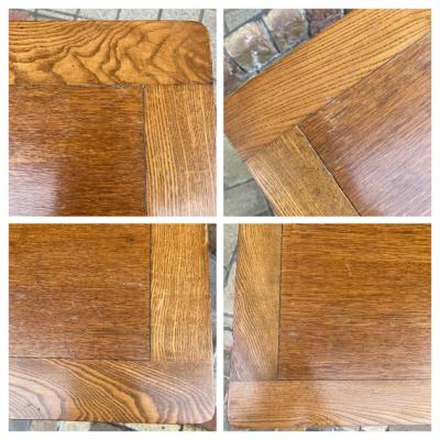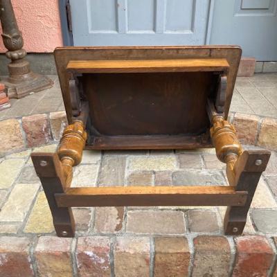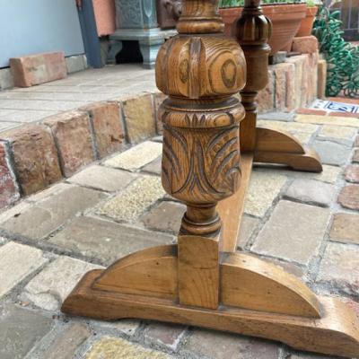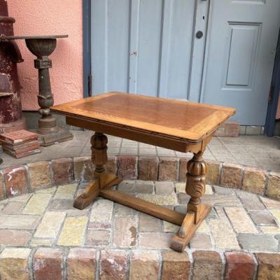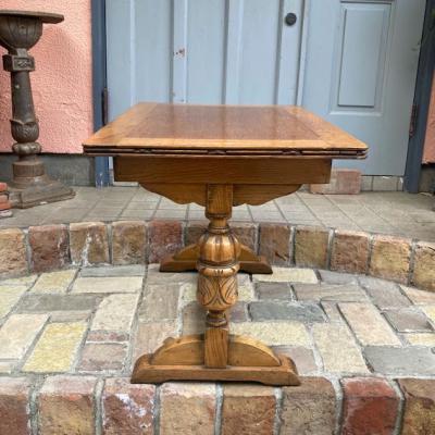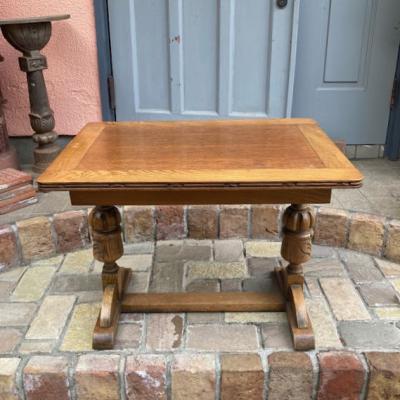 ぱっと見のインパクトが強いバルボスレッグと呼ばれる球根をモチーフにした丸い脚を持つローテーブル。高さが約50㎝ほどの高さで小ぶりなためソファーや床に座る方、ベッドサイドなどに良さそうなサイズ感です。天板の色は明暗2色を組み合わせたデザインに加えフチに細やかな彫刻を施すことで立体感のある見え方をします。写真では見えにくいですが、光の当たり具合で天板の上に半円状の凹み傷がうっすらと浮かび上がります。イギリスでは長い間持ち主を支えてくれた勲章として、小さな傷や凹み、修復の跡なども含めて慈しみ風合いを楽しみながら長く使っていくそうです。物を代々大切に使い続ける素敵な文化ですね。発送前に再度クリーニングを行いますが、ピカピカの新品をお求めの方はご遠慮ください。福岡市南区の店舗にてお渡しもできますのでお気軽にどうぞ!
