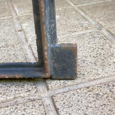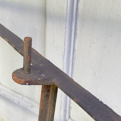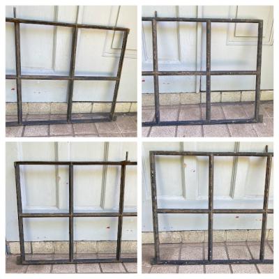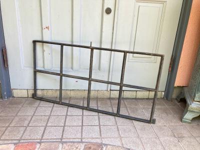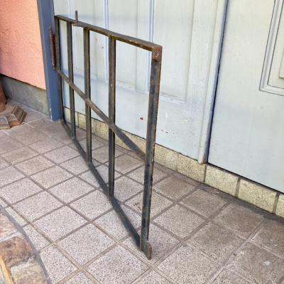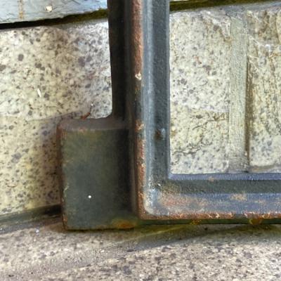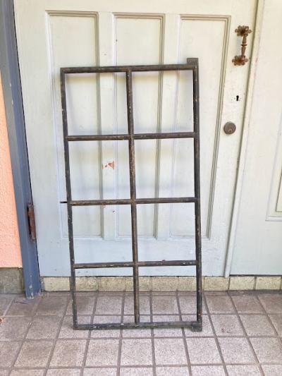 イギリスのアイアン窓枠。ガラスはありません。横向きに立てると水平ですが、左右に小さな出っ張り(各20mmずつ)があるため、縦方向に立てる場合はやや斜めになります。縦向きにご利用を検討中の方はご自身の契約されている施工業者さまにお問合せください。真ん中付近にも出っ張り(約36mm)があります。ネジを固定する穴などはありません。ガラスがありませんが、壁に埋め込んだり、お庭や玄関でツタ系のグリーンを這わせても素敵ですね。サビもありますが、あえてそのままに残してあります。古い時代を感じる雰囲気がお好きな方におすすめ。ピカピカの新品をお求めの方はご遠慮ください。福岡市南区の店舗にてお渡しもできますのでお気軽にどうぞ!