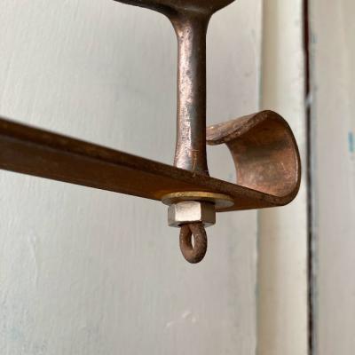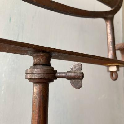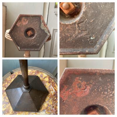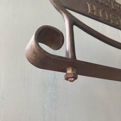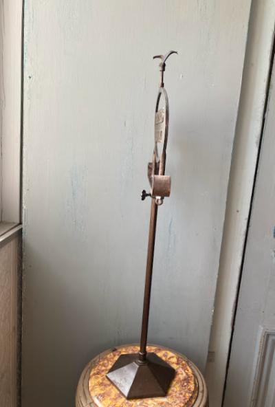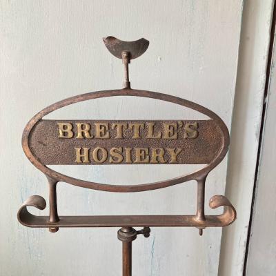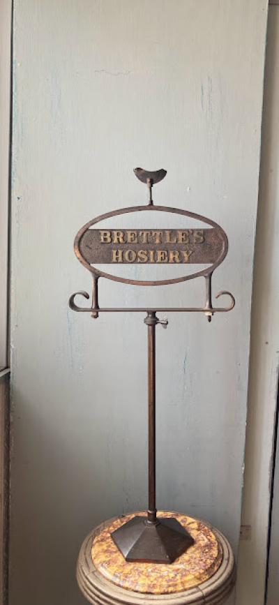 イギリス1930年代BRETTLE’S HOSIERYのショップスタンド。全体的な鈍い色合いや佇まいが歴史を感じさせてくれますね。土台部分はアイアン、上部のロゴ部分は真鍮のようです。中ほどのネジを緩めると高さ約60㎝から約92㎝まで伸ばすことができます。先端の部分は少し変形があります。ロゴの下を留めてあるネジは現地にて交換されたもののようです。底の部分に数字の「5」「L7710」の刻印入り。お店のディスプレイやお部屋の飾りなどおすすめです。ピカピカの新品をお求めの方はご遠慮ください。福岡市南区の店舗にてお渡しもできますのでお気軽にどうぞ!