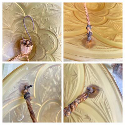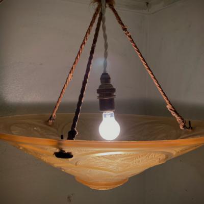 フランスHANOTSのアールデコ照明。1930年代。飴色の本体部分はすべてオリジナルのままの照明です。本体のシェード+日本で使用できる口金サイズE17ソケット付きのコードセット。コード部分は新しいものになりますので、LED電球(口金サイスE17)を使用可能。直接光源が目に入らないので優しい光に包まれます。少し短めにしてガラスから離した方が光が柔らかな印象でした。ご使用になる場所で電源の位置が違いますので、天井のソケットからの長さをご確認ください。ガラスのフチに小さく「HANOTS」のロゴ入り。アンバー色ガラスには古いガラス特有の気泡や小さな傷を含み、本体を吊るす紐は当時のままの物ですので、ほつれがあります。撮影に使用した電球は白熱球25W を使用しており、明かりを灯すと側面のカットがクッキリと美しく浮き出ます。下から見ると花柄模様のようでとても素敵ですよ。リラックスして過ごしたいお部屋の照明をお探しの方におすすめ。こちらの商品はオリジナルの紐を使用しているため長さ調整はできません。別に付属のコードのみ1mまで無料で長さ調整できますのでご相談ください。ピカピカの新品をお求めの方はご遠慮ください。福岡市南区の店舗にてお渡しもできますのでお気軽にどうぞ!