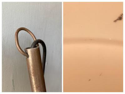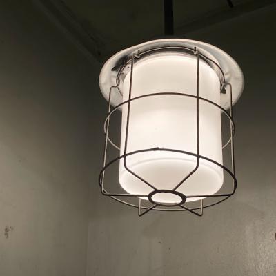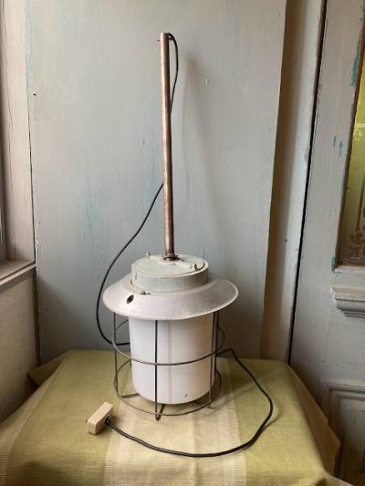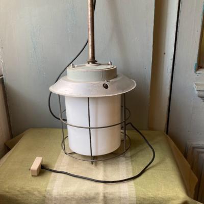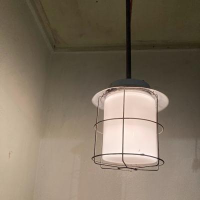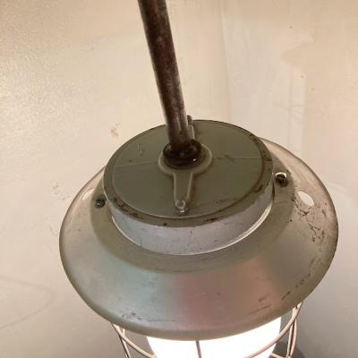 チェコスロバキア製。明かりを灯すと周りのワイヤーがランタンのようなシルエットに見えカッコいい雰囲気に。ビンテージ感の溢れるたたずまいは、飾る場所をお洒落に演出してくれそうです。電球を交換する際には上の傘の部分ををひねって持ち上げ、左右に固定してあるネジを緩めてからギャラリーを回して外すと簡単に交換できます。(プラスドライバーだけはご準備ください。)天井から約67㎝ほど長さがありますので、設置予定の場所の高さをご確認くださいね。古いお品となりますので、サビ凹み等の風合いはあります。使い込まれた雰囲気がお好きな方におすすめ。撮影機材の都合上白ぽい明かりに見えますが、電球色を使用しているため付属する電球はオレンジ系色味で使用する電球により見え方が変わります違って見えます。ピカピカの新品をお求めの方はご遠慮ください。福岡市南区の店舗にてお渡しもできますのでお気軽にどうぞ!