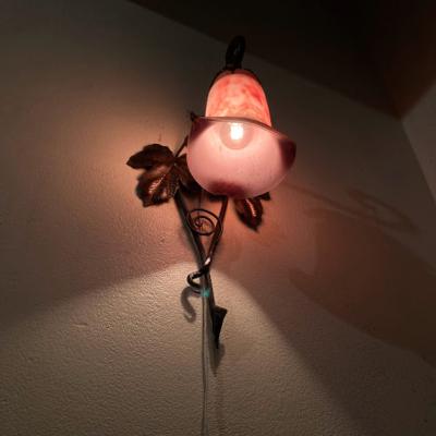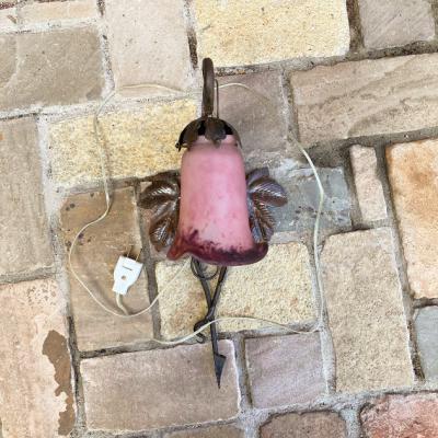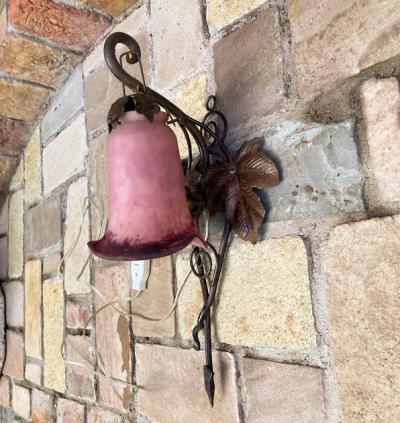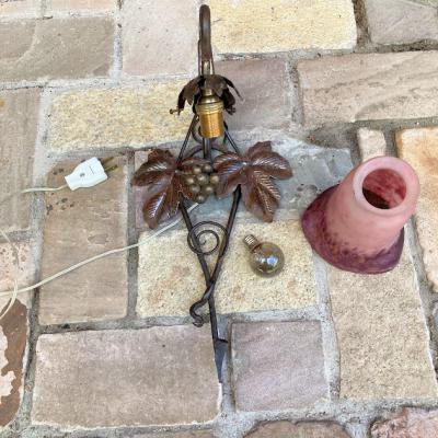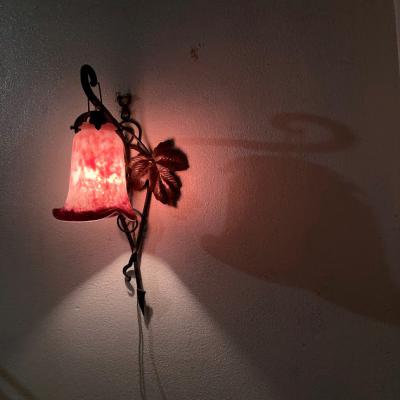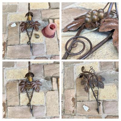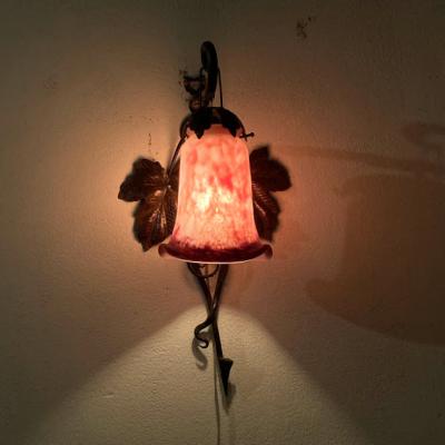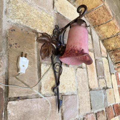 フランス製19世紀初頭、アールヌーボーらしいぶどうをデザインしたアイアンベースの壁掛け照明。幾重にも重ねた色ガラスを通した光は神秘的で美しくお部屋を照らしてくれます。電球の部分は日本の電球に対応できるように交換済み。口金サイズE17サイズの電球を使用できます。LED電球にも対応可能。撮影時には点灯テストを行うために先端にコンセントを付属してありますが、施工中の方は壁面内へ配線工事になるかと思われますので、先端は外してお届けすることもできます。また、先端を四角の引っ掛けシーリングへと交換もできますのでお気軽にお申しつけください。アイアンのベース部分には真鍮のぶどうがデザインされています。廊下や間接照明、店舗照明をお探しの方におすすめ。ピカピカの新品をお求めの方はご遠慮ください。福岡市南区の店舗にてお渡しもできますのでお気軽にどうぞ!