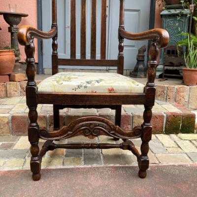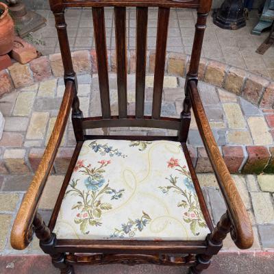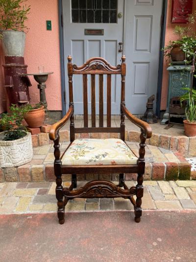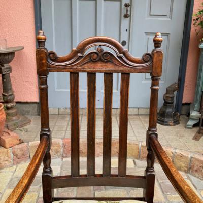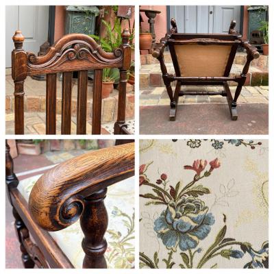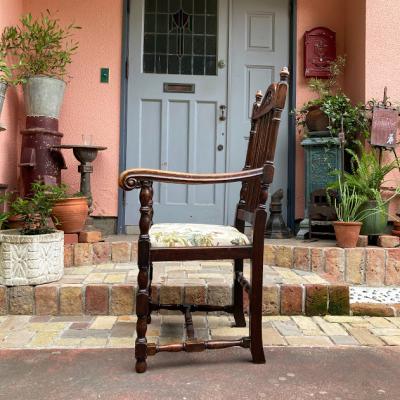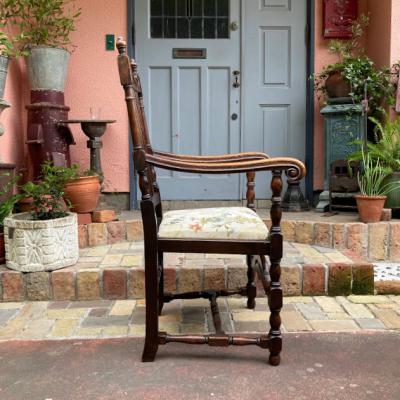 立体的な彫刻が美しいオーク材のアームチェア。1930年代。座面部分は張替え済みのため安心してご利用いただけます。ひじ掛けがあるので立ち上がる際にとても楽でおうち時間をゆっくりと楽しめますね。アンティークらしい風合いはありますが、大きな傷などはなくコンディションは良いほうです。クラシックなお部屋作りや、自分だけの1脚を探している方におすすめ。やや大きめのサイズとなりますので、搬入予定の通路などに入るかサイズをご確認ください。
