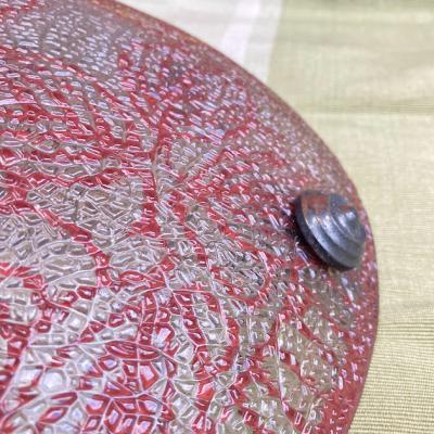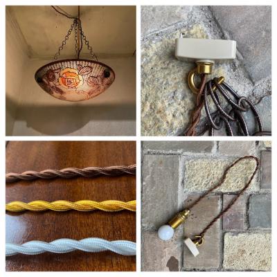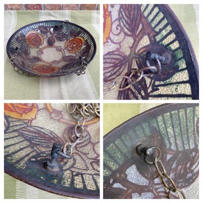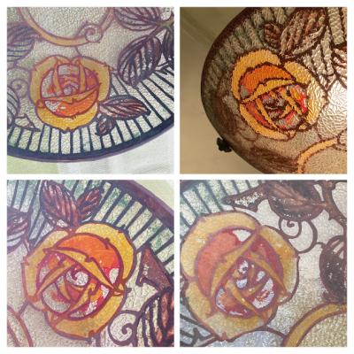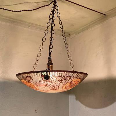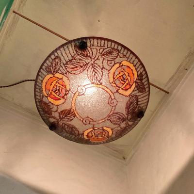 フランスアンティークのガラス照明。推定1930年代。外側は凹凸のあるガラスでキラキラときらめき、内側はダイナミックに3つのバラが描かれ優しい雰囲気。電球のパーツとシェードは別々になっており、シェードは3つのチェーンで吊り下げるだけのシンプルな構造です。光源が直接目に入らないのでリラックスするお部屋や寝室などにおすすめ。照明の口金部分は日本仕様に変更してありますので口金サイズE17サイズの電球が使えます。LED電球にも対応しています。撮影時は白熱球・電球色25Wとやや暗めの電球を使っているため、ワット数や電球の種類によっては見え方が違ってきます。コードの色はお部屋に合わせてゴールド・ブラウン・ホワイトに変更でき、長さは1mまでは長さ調整無料です。ご希望の色や長さをお知らせください。福岡市南区の店舗にてお渡しもできますのでお気軽にどうぞ!