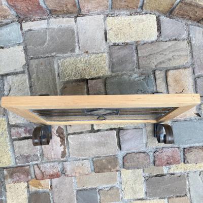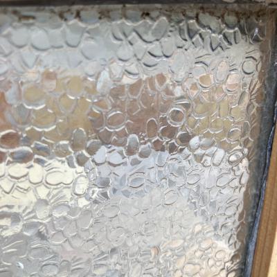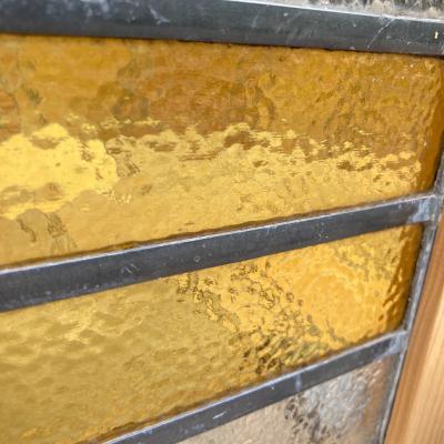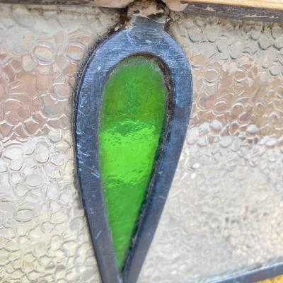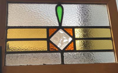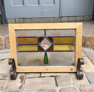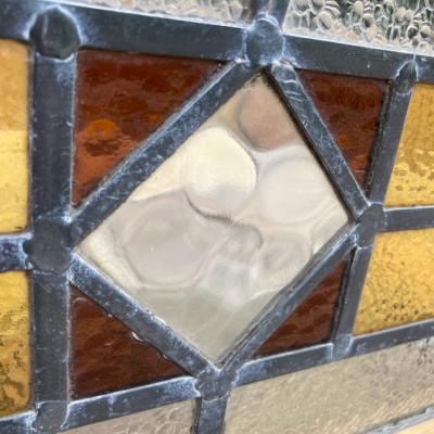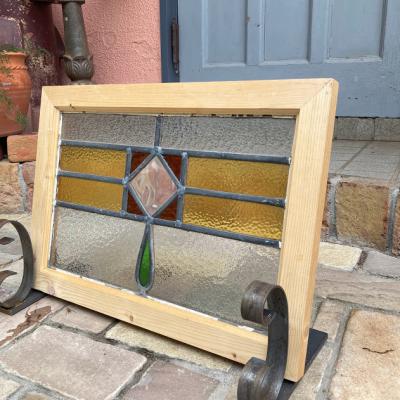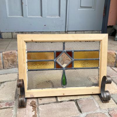 落ち着いた色合いの幾何学模様のステンドガラス。派手すぎない落ちついた色合いに加え、数種類の不透明なガラスを組み合わせてありプライバシーも保護されます。幾何学模様ですので上下どちらでも楽しむことができますね。周りの枠は日本で新しく作成しました。木枠は彩色しておりませんのでお好きな色にペイントされてください。ガラス部分は約41㎝×26㎝と比較的小さなサイズ感。窓辺のインテリアや、店舗什器をお探しの方におすすめ。