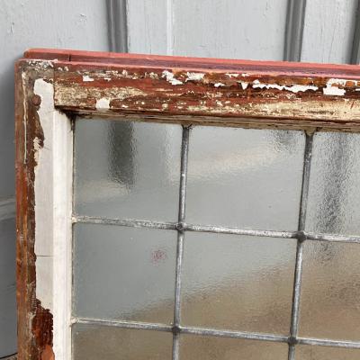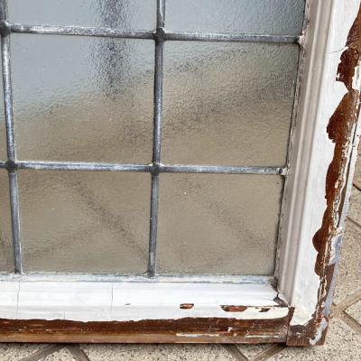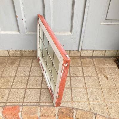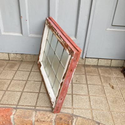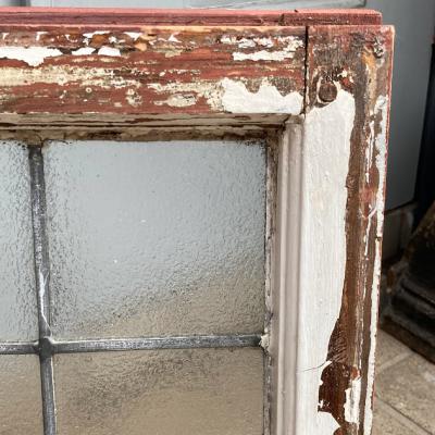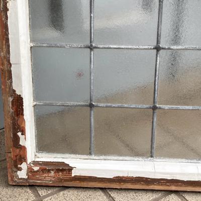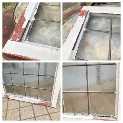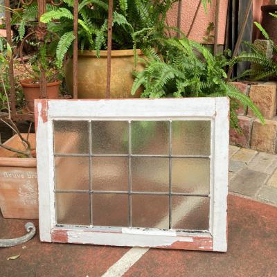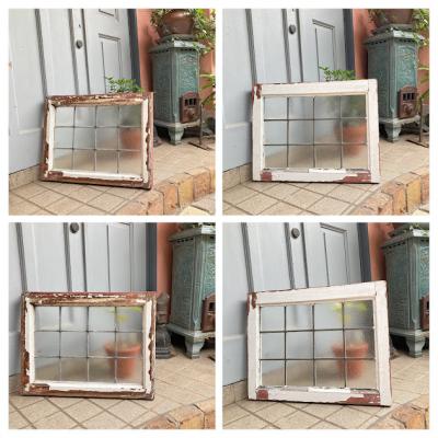 カラーレスガラス【B】。推定1940年代。独特の不透明なガラスは中の様子がハッキリと見えないのでプライバシーも安心ですね。透け具合は後ろに植木鉢を置いている画像をご覧ください。周りの木枠はホワイトにペイントされていますが、ポロポロと剥がれ落ちます。ガラスは12マスに分かれておりケイムと呼ばれる枠は綺麗な状態を保っています。取り付けにつきましては、ご自身の契約されている施工業者さまにこのガラスが取り付け可能か事前にお問合せください。同じようなカラーレスガラスを販売しておりますが、一つずつガラスの質感が違いますのでご注意ください。破損を考慮し枠の取り外しは行っておりません。福岡市南区の店舗にてお渡しもできますのでお気軽にどうぞ!