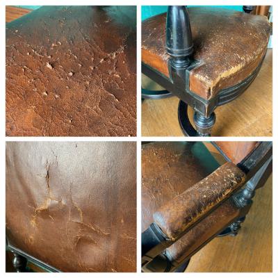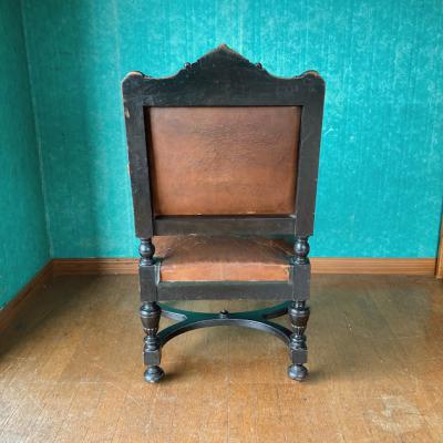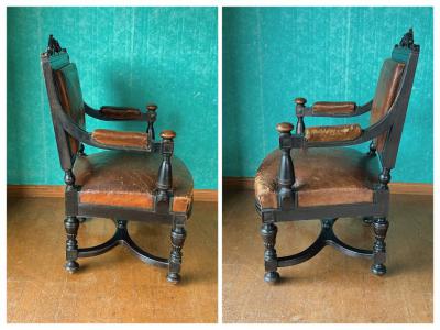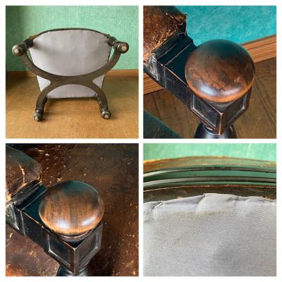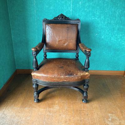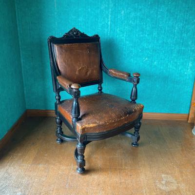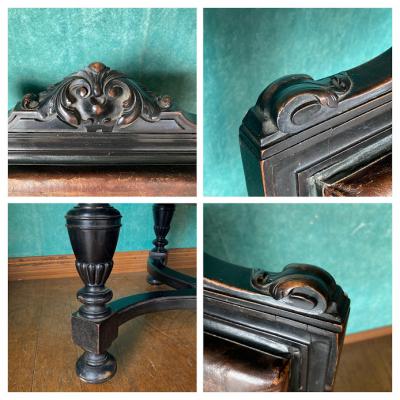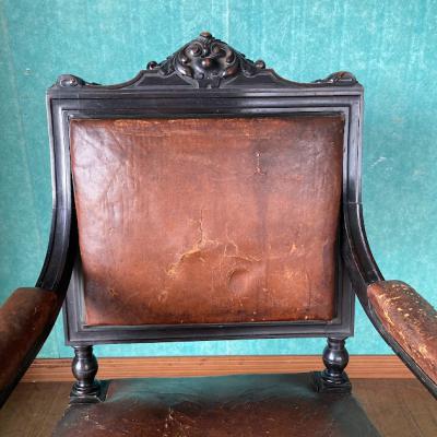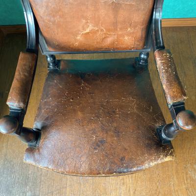 ナポレオン3世(1800年代後半)の貫禄あるアームチェア。ウォールナットをベースに黒く塗装されている様子はフランスの家具らしいたたずまい。座面の生地はレザーを使用してあります。欧州ではできるだけオリジナルの状態を残す方がより喜ばれるため、表面はそのままの状態を残し、底のみ現地で新しい布に張り替えた跡がありました。長きに渡りたくさんの人々に癒しを与えてきた椅子ですのであえてこのままの状態にしてあります。この存在感は店舗のティスプレイ什器など、傷や凹みなども含めてお楽しみいただける方におすすめ。撮影などでは商品が引き立ちます。もちろん一般のお客様の特別な1脚としてもどうぞ。個人差がありますが、座った感じは少し柔らかい感じがしました。福岡市南区の店舗にてお渡しもできますのでお気軽にどうぞ!