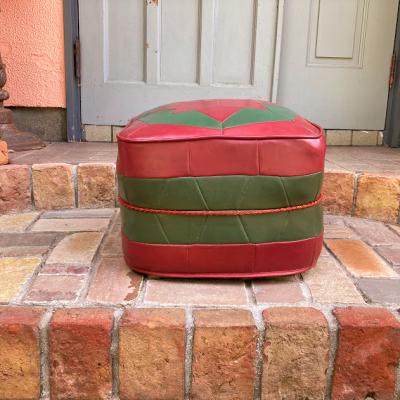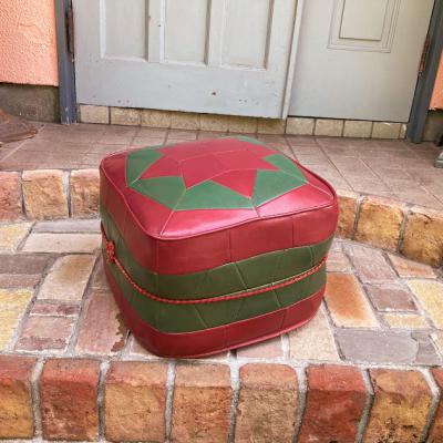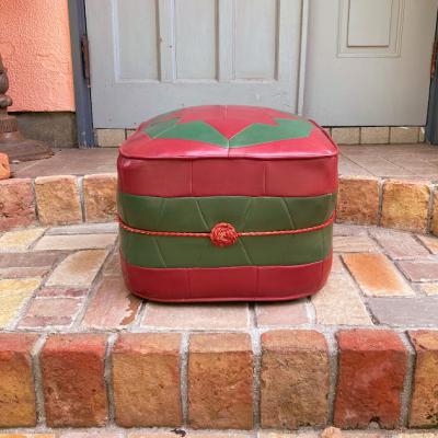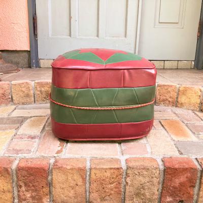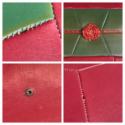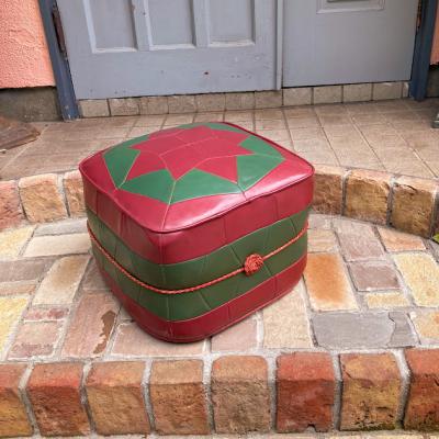 赤と緑のレザーをパッチワークのように組み合わせたフロアクッション。イギリスより入荷しました。1960年代のビンテージ。真ん中にある赤い組紐のようなデザインが特徴的ですね。上の面は星のようなデザインでカッコいい雰囲気。一人掛けのフロアクッションやオットマンとしてもいいですね。60年代のビンテージ品らしく小さな傷などの風合いがありますが、しっかりと作られています。お部屋のアクセントになる椅子をお探しの方におすすめ。ピカピカの新品をお求めの方はご遠慮ください。福岡市南区の店舗にてお渡しもできますのでお気軽にどうぞ!