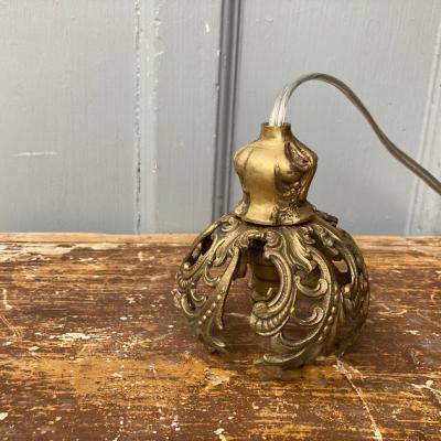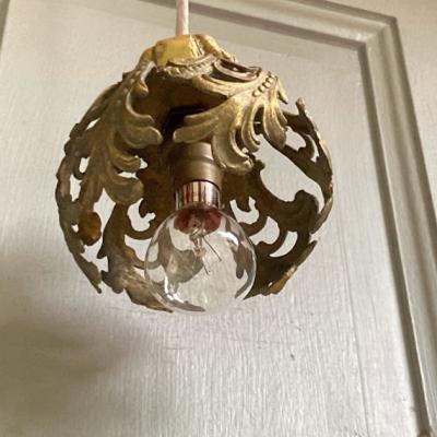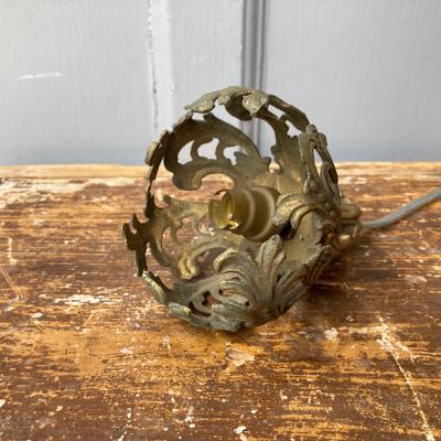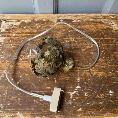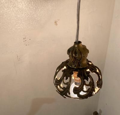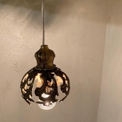 フランス18世紀後半の古いシャンデリアパーツを使用した小さな照明。海外仕様のピン式の電球を使用します。直径約9cmと手のひらに乗るくらいの大きさですので、廊下や玄関、トイレなどほんのりと照らしたい場所にいいですね。電球を灯すとシェードのデザインが壁に反射してシルエットも素敵です。コードの長さは約55㎝、角型引っ掛けシーリングを付属しており、撮影に使用したお試し用のピン式電球(B15サイズ・20W)も付属しますので届いてすぐにご利用いただけますよ。鈍い真鍮の色合いが歴史を感じさせてくれますので、古いものがお好きな方向き。ピカピカの新品をお求めの方はご遠慮ください。福岡市南区の店舗にてお渡しもできますのでお気軽にどうぞ!