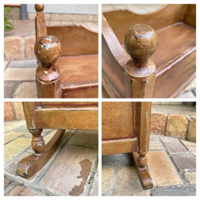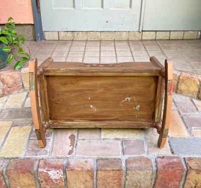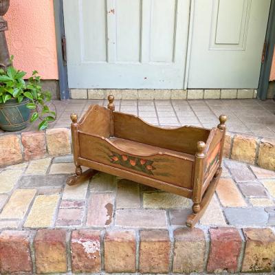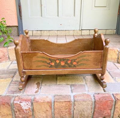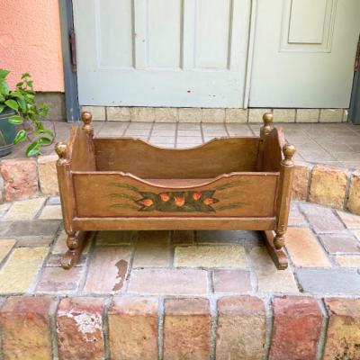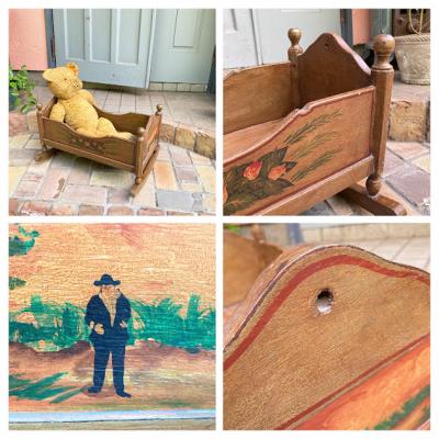 ゆらゆらと揺れる木製のベビーベッド。ハンドペイントで素朴なお花や風景の絵柄が周りを取り囲みます。赤ちゃんが触りそうなフチの部分などは角にならないように丸くカットしてありとても優しさを感じさせてくれるお品です。犬や猫、ぬいぐるみなどのペット用のベッド、写真スタジオなどの撮影小物、店舗やお部屋のアクセントにいいですね!端には紐を通すような穴が対角線上に空いていました。底には床に傷がつかないようにフェルトが貼ってありました。撮影時に使用したテディベアは全長約60㎝の物を使用しております。温かみのある雰囲気がお好きな方におすすめ。アンティークらしい風合いがありますので、ピカピカの新品をお求めの方はご遠慮ください。