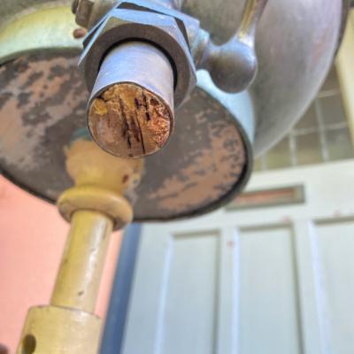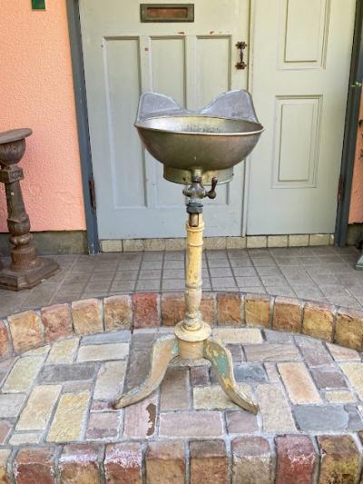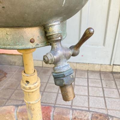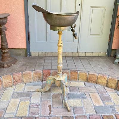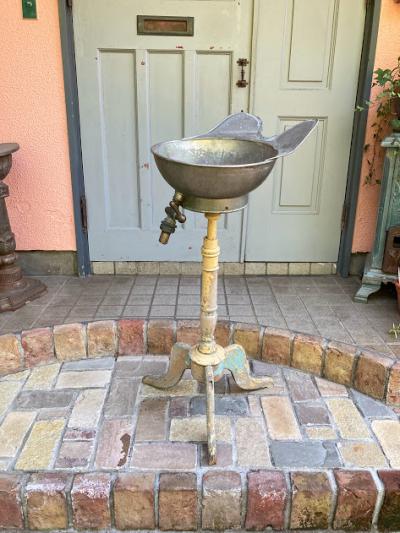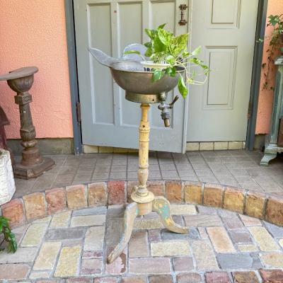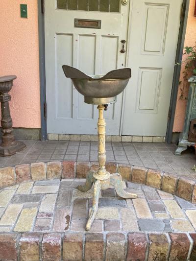 かなり珍しいヘアーウォッシングスタンド。現地セラーによると1920年代フランス製とのこと。現在の理容室の洗髪台の原型のようなものです。土台はアールデコ調の木製で上部に金属製(ブリキ)のトレイが付属しており、蛇口のような部分から排水を行っていたようです。蛇口の先端にはコルクのようなものが詰め込まれていました。全体的にシャビーシックな佇まいが素敵です。お花を飾ったり、店舗のディスプレイやガーデニングのアクセントとしても活躍しそうですね。この独特の雰囲気が好きでオリジナルの使い方がピン!ときた方向き。ピカピカの新品をお求めの方はご遠慮ください。