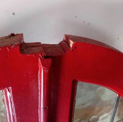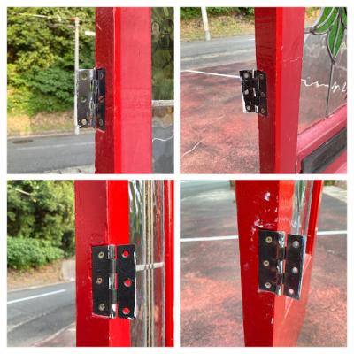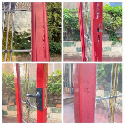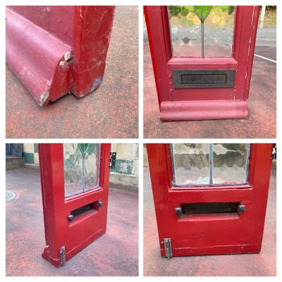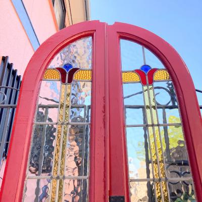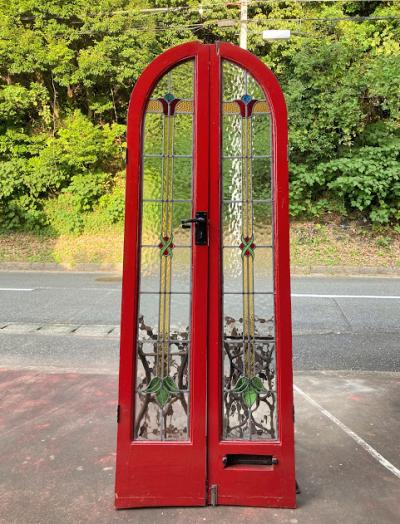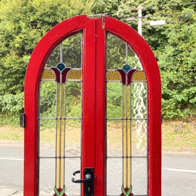 真っ赤なペイントにステンドガラスをはめ込んだ両開きドア。お部屋のアクセントとして活躍してくれますね。上部に凹んだような形に見える部分がありますが、破損ではなく取り付けられていた場所に合わせて調整された跡のようです。左右4か所に丁番が付属していました。下の部分には小さめのレターボックスが付属。外側に使用されていた面はペイントの艶が少なく、内側の部分は艶やかです。ペイント部分に経年による小さな傷は見受けられますがステンド部分には割れはなく、メラメラとした不透明なガラスのため光は通しますが、シルエットはぼんやりとしか見えないのでプライバシーの保護にもいいですよ。店舗什器やリノベーションなどにおすすめ。取り付けにつきましては、ご自身の契約されている施工業者さまにお問合せください。追加で別角度の写真をお送りすることもできますのでお気軽にお問合せください。